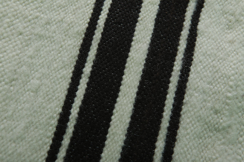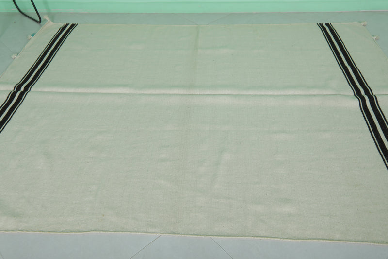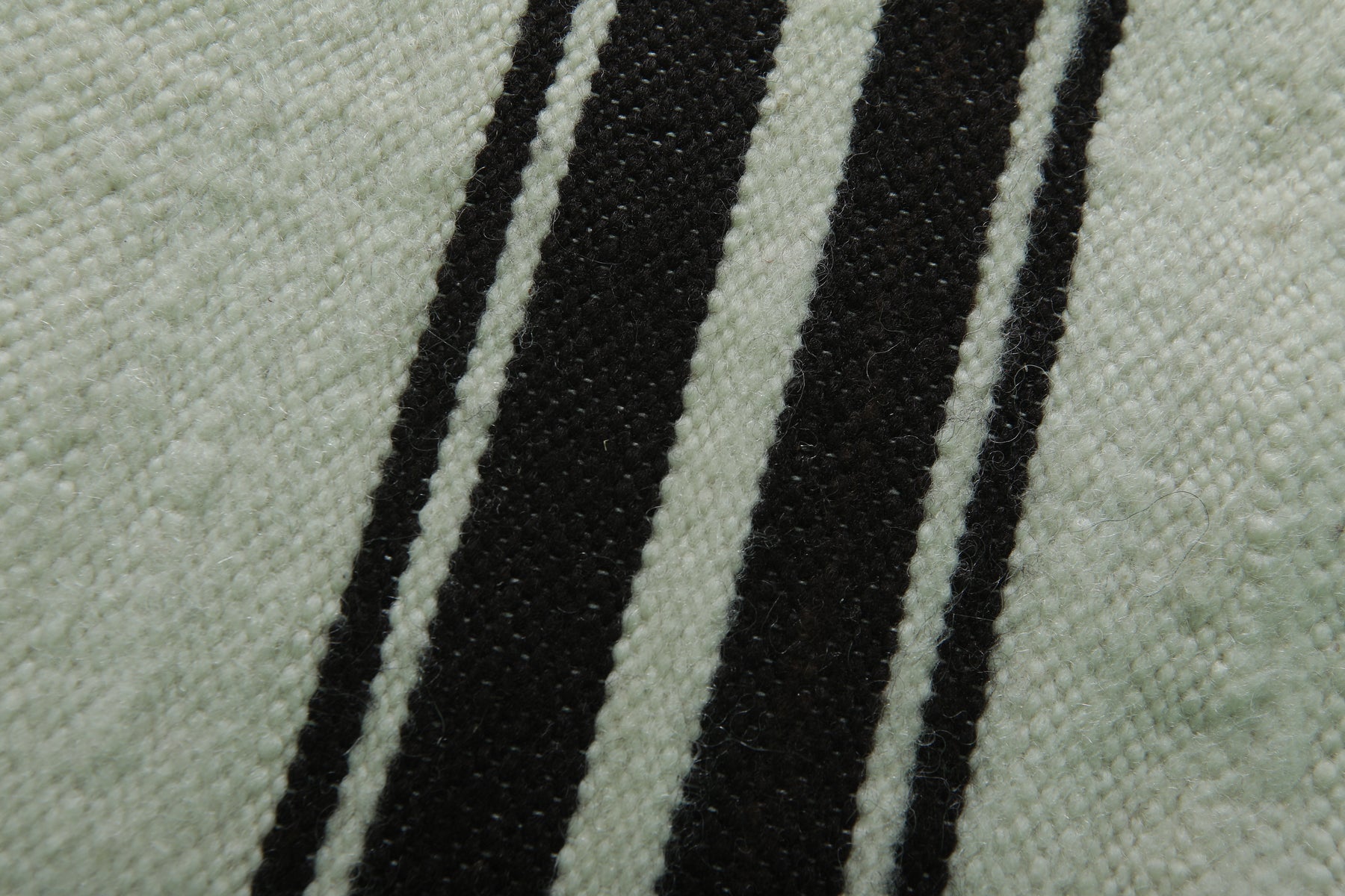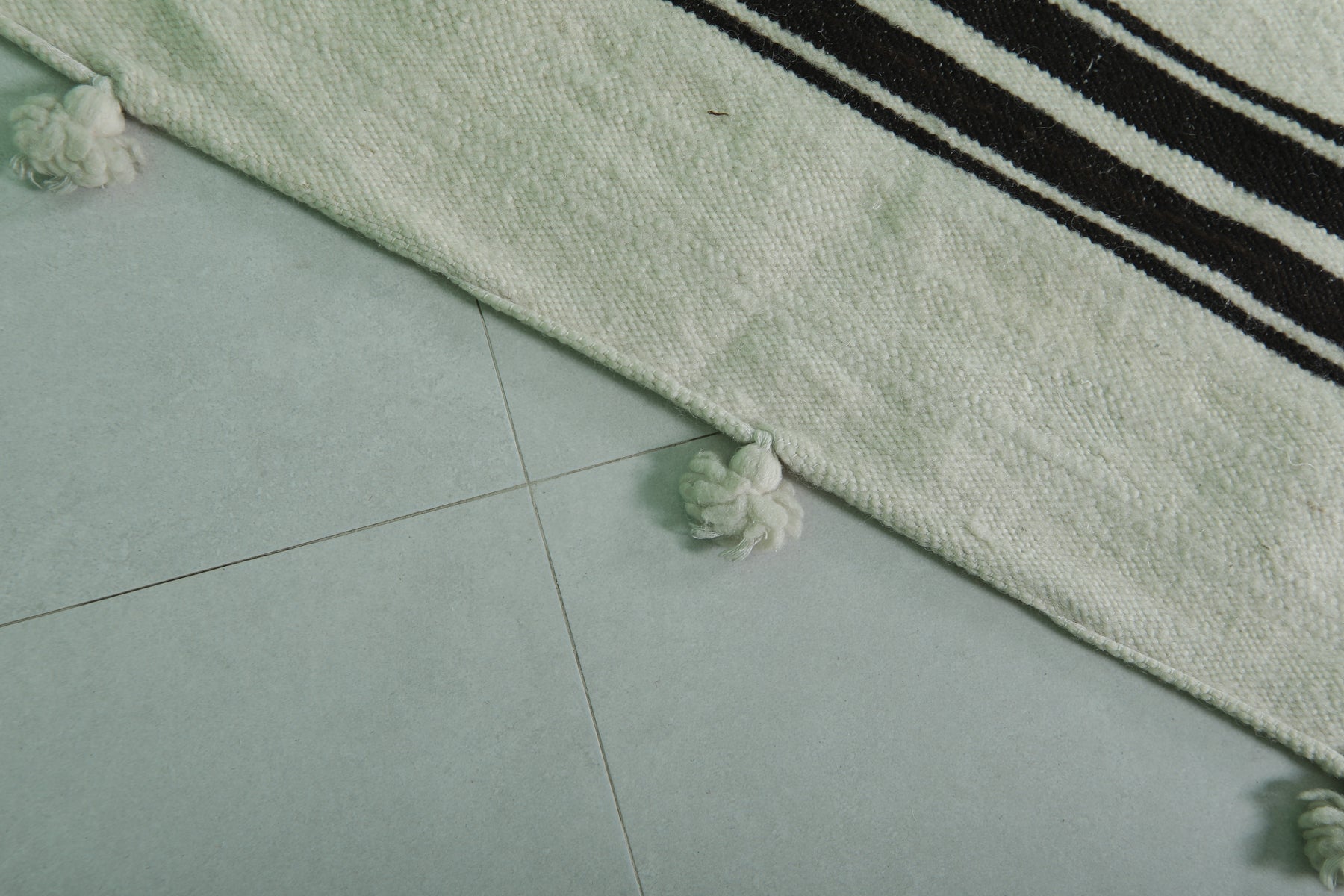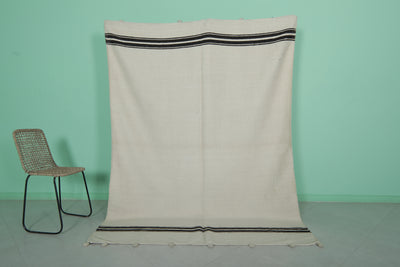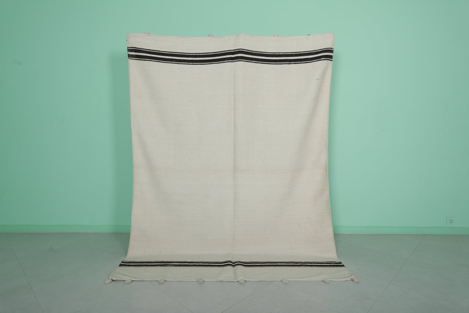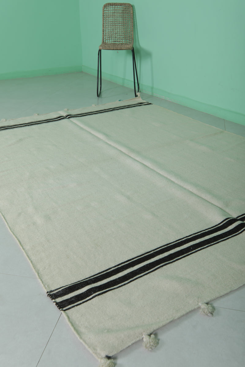 This 5.9 x 7.8 feet Vintage Moroccan Handwoven Kilim features a timeless neutral palette with minimalist black stripes, blending simplicity with artisanal craftsmanship. Handwoven from premium wool, this versatile piece is perfect for modern or traditional interiors.