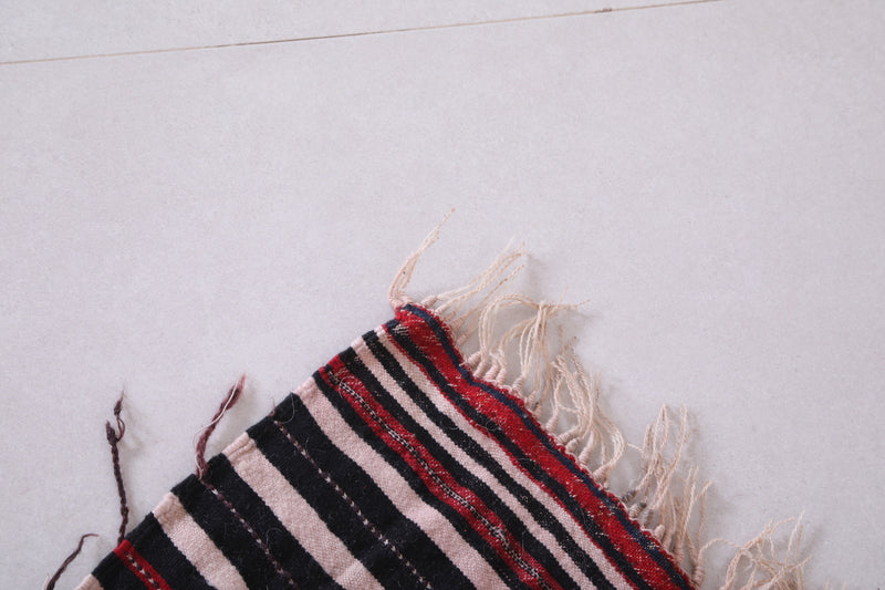 This 3.2 x 5.1 feet Vintage Moroccan Handwoven Kilim features a bold striped design in rich black, red, and white tones, blending traditional craftsmanship with modern aesthetics. Handwoven from premium wool, it offers exceptional durability and warmth, making it perfect for accenting living spaces, hallways, or eclectic interiors.