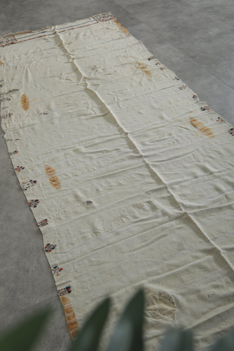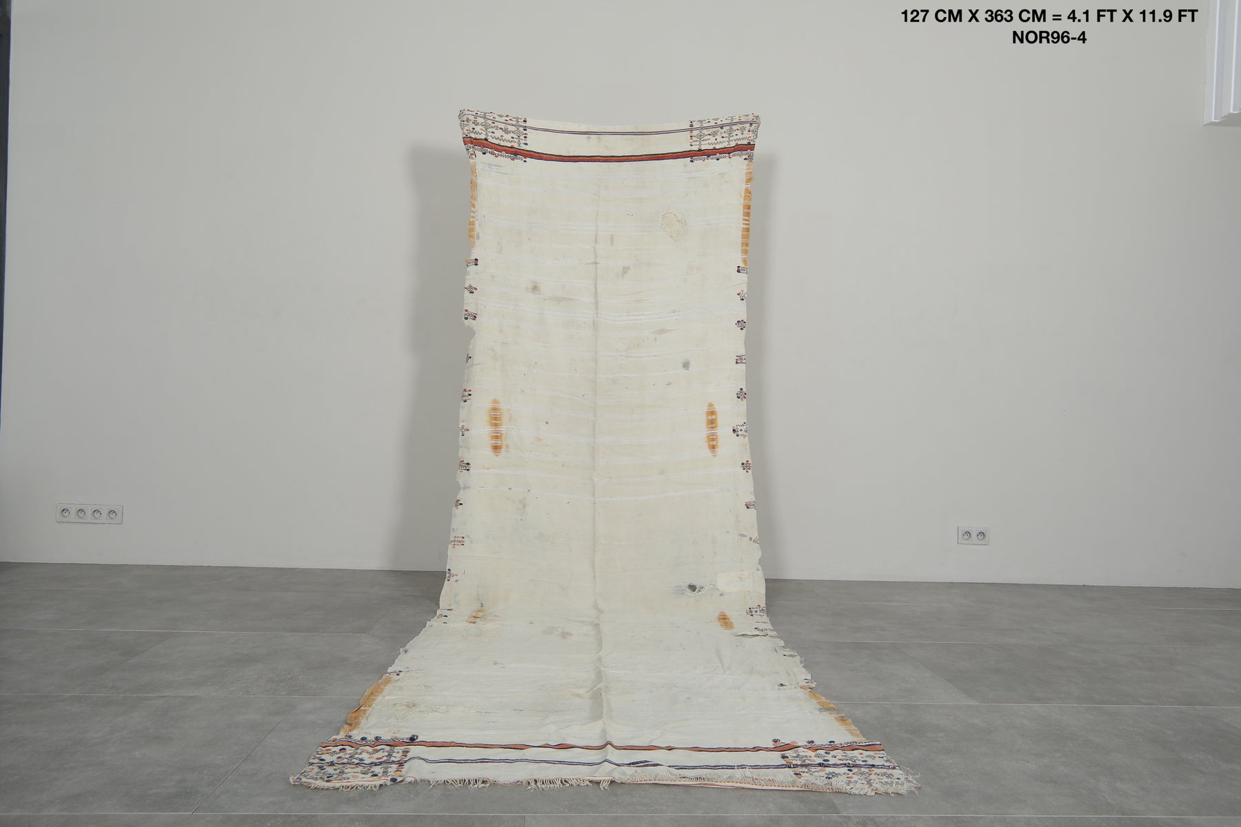 This 4.1 x 11.9 feet Vintage Moroccan Handwoven Kilim showcases a classic natural design with subtle embroidered details, blending sophistication with cultural richness. Handcrafted by expert artisans, this rug brings both beauty and durability, making it ideal for large rooms, hallways, or as a statement piece.