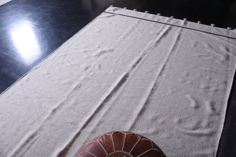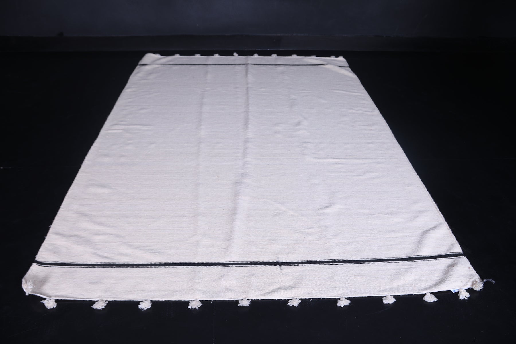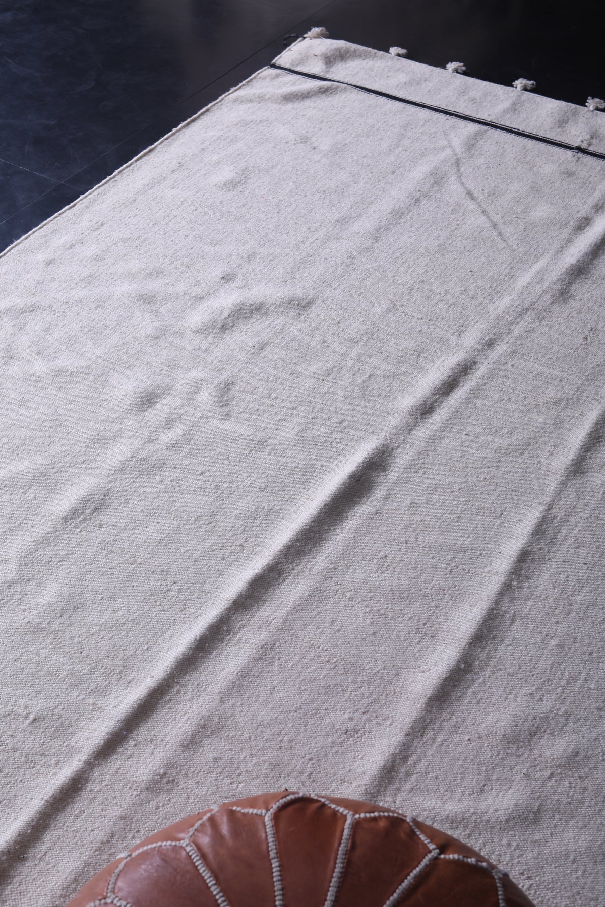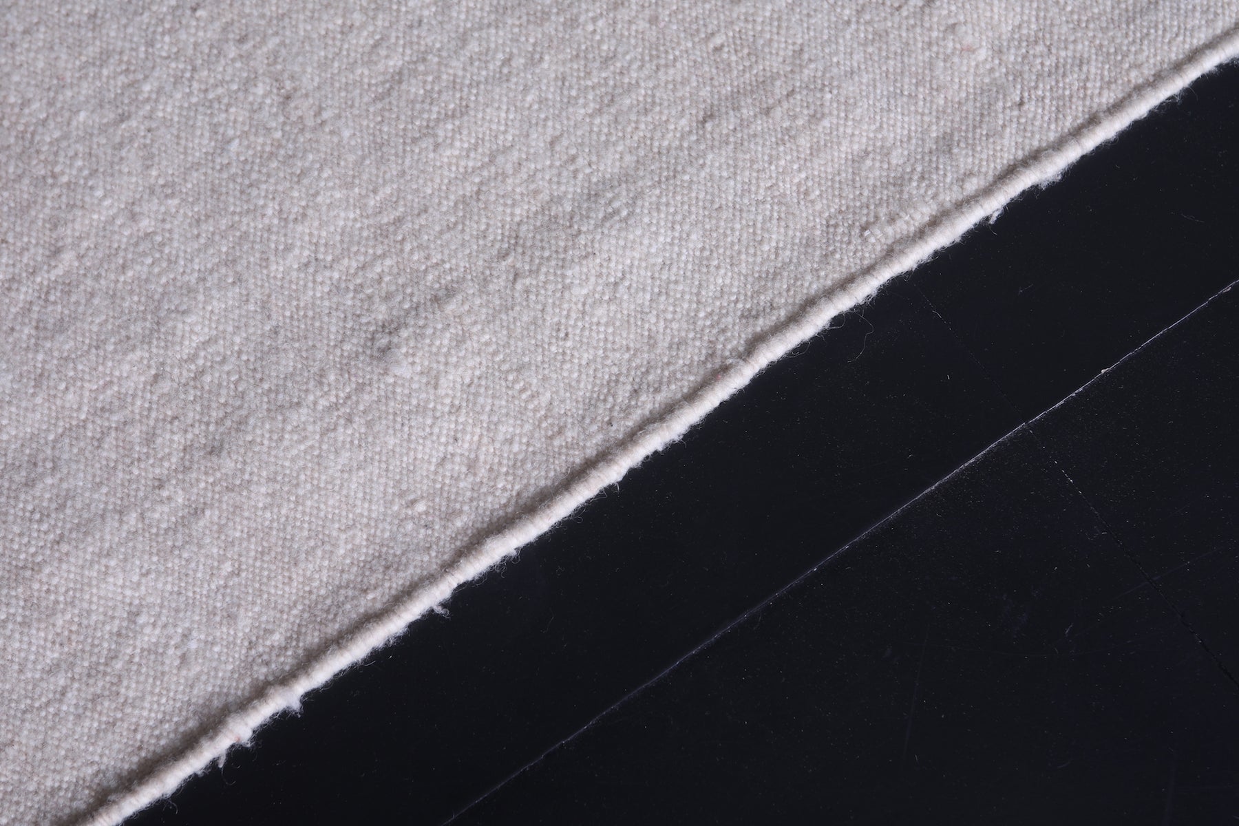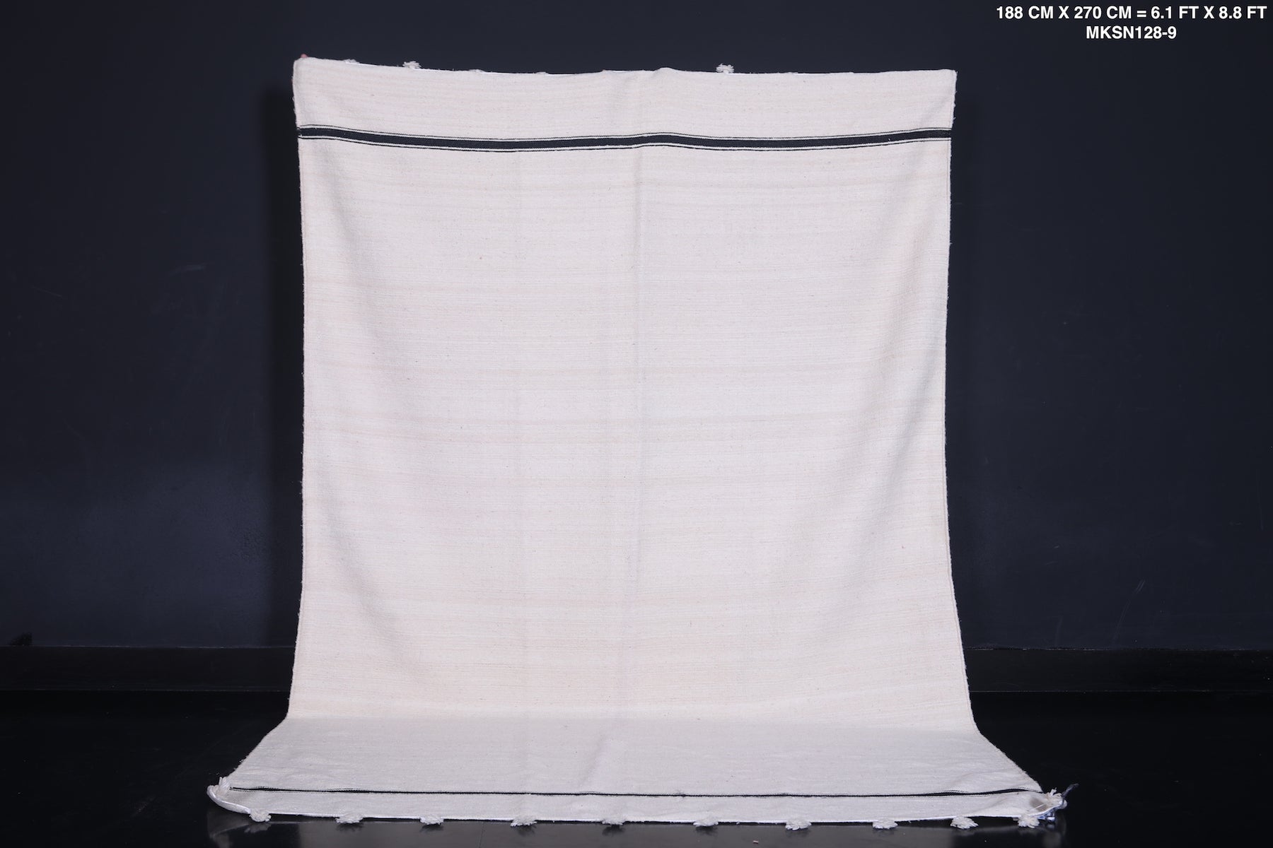 This 6.1 x 8.8 feet Vintage Moroccan Handwoven Kilim features a clean, minimalist design with subtle black detailing, offering a timeless blend of tradition and modernity. Handwoven by skilled Moroccan artisans, this lightweight kilim adds charm and practicality to any space.
