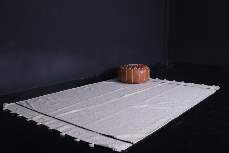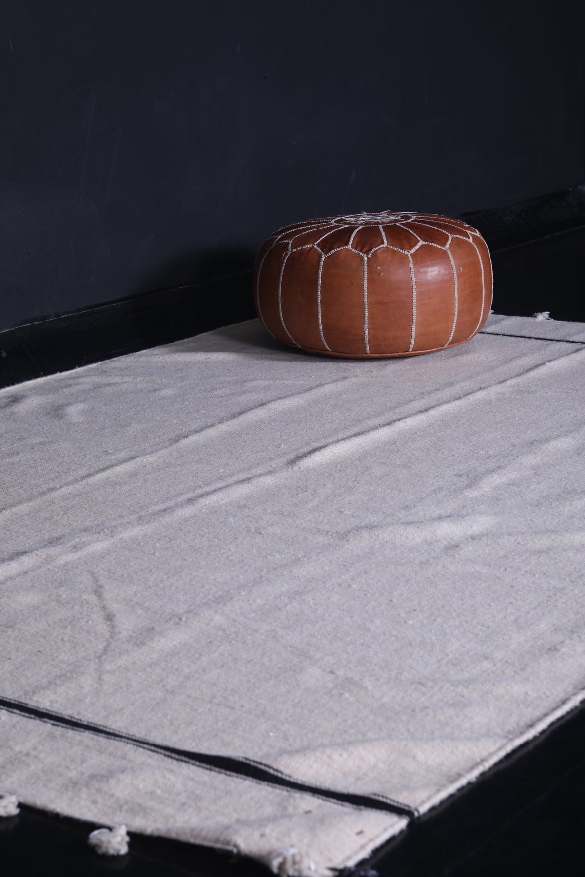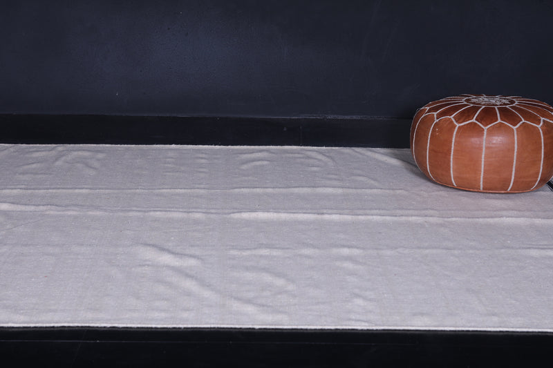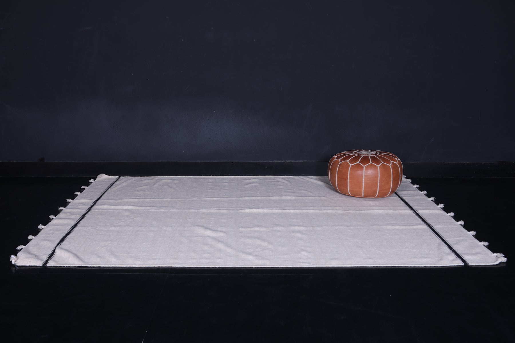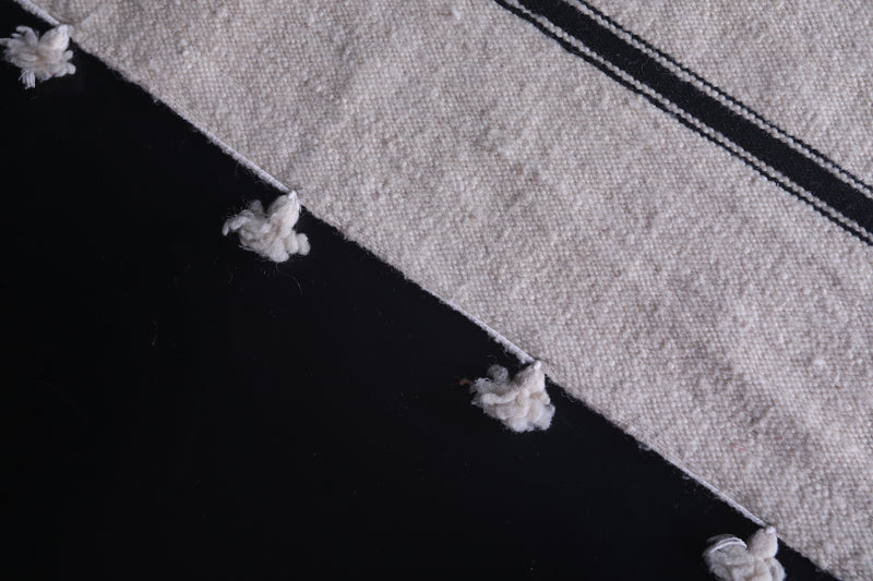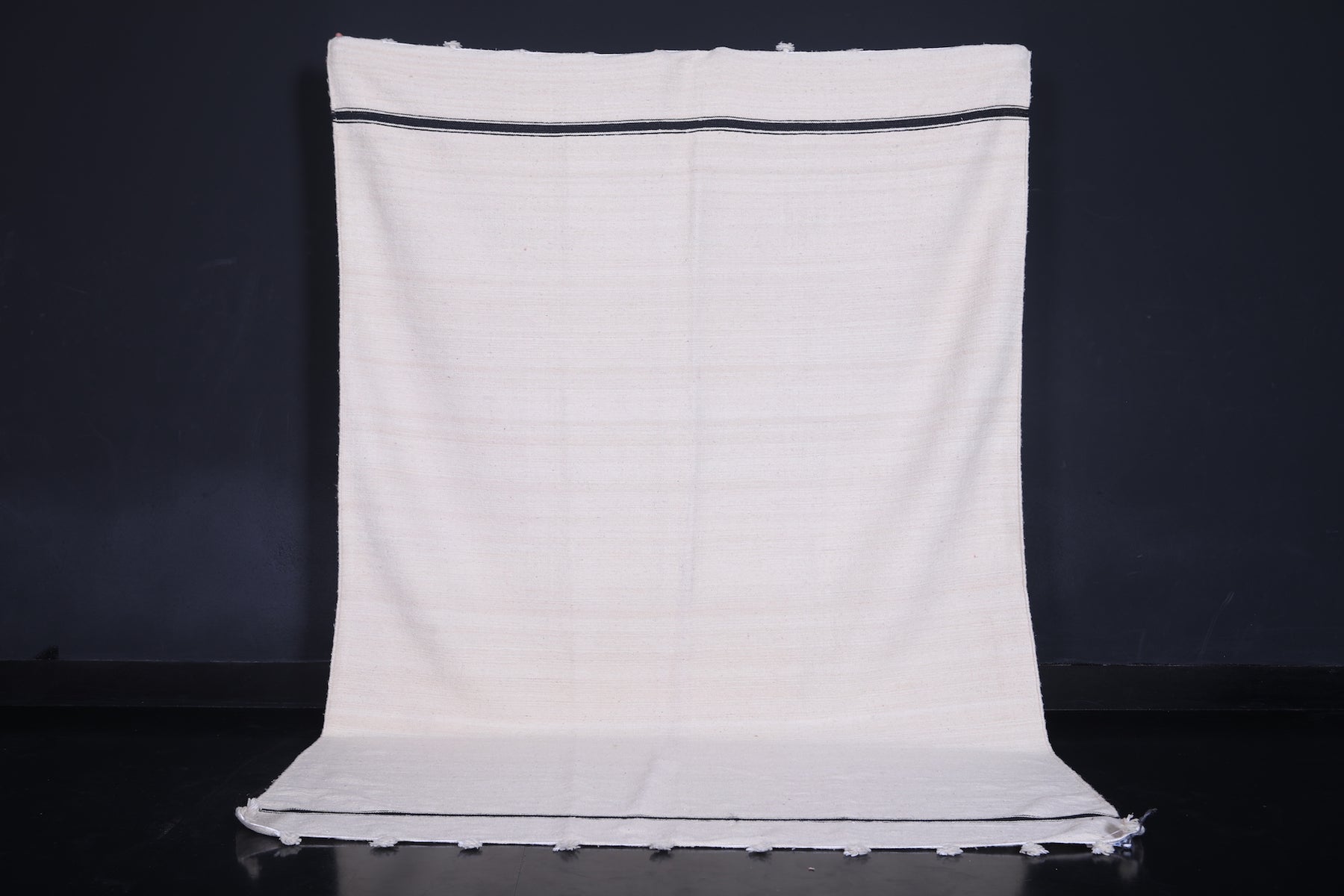 This 6.1 x 8.8 feet Vintage Moroccan Handwoven Kilim features a clean, minimalist design with subtle black detailing, offering a timeless blend of tradition and modernity. Handwoven by skilled Moroccan artisans, this lightweight kilim adds charm and practicality to any space.