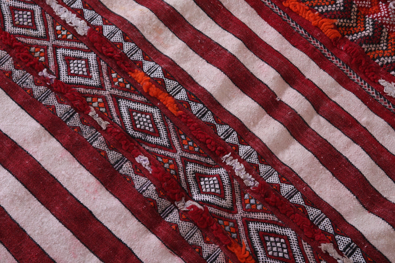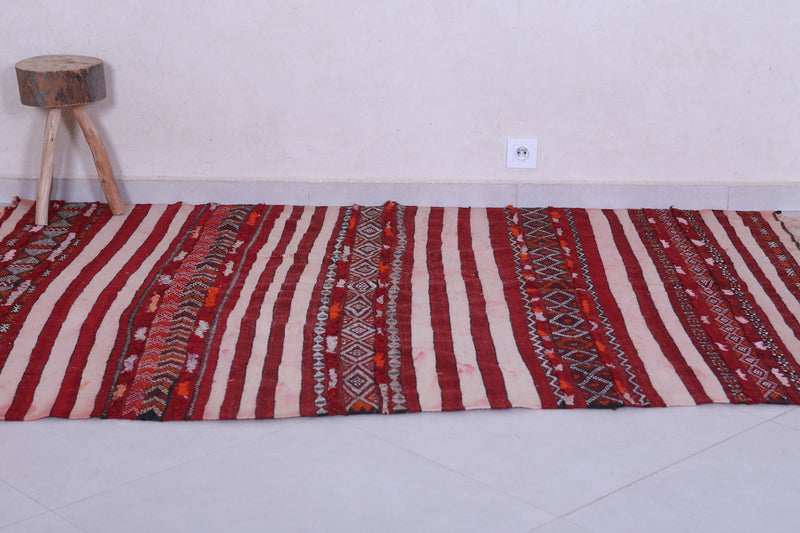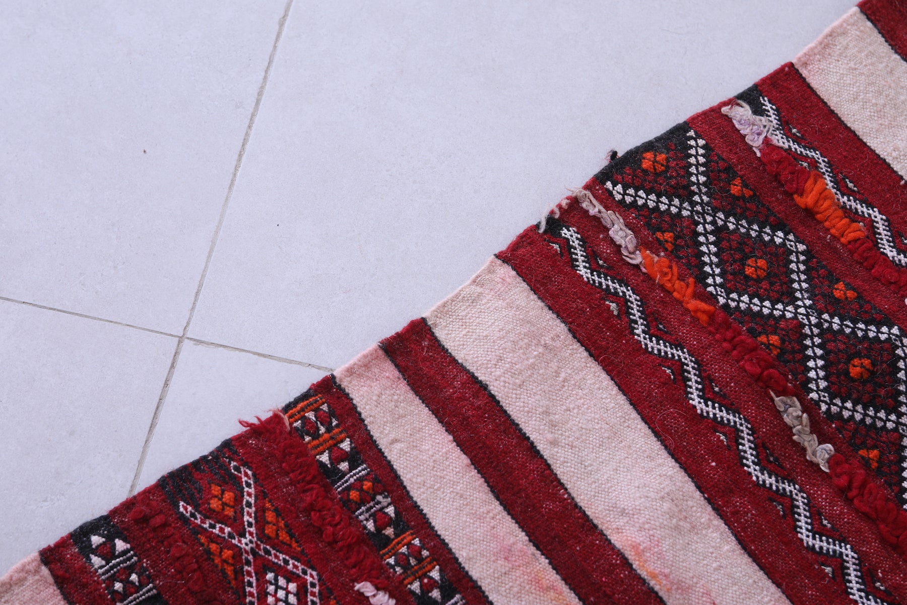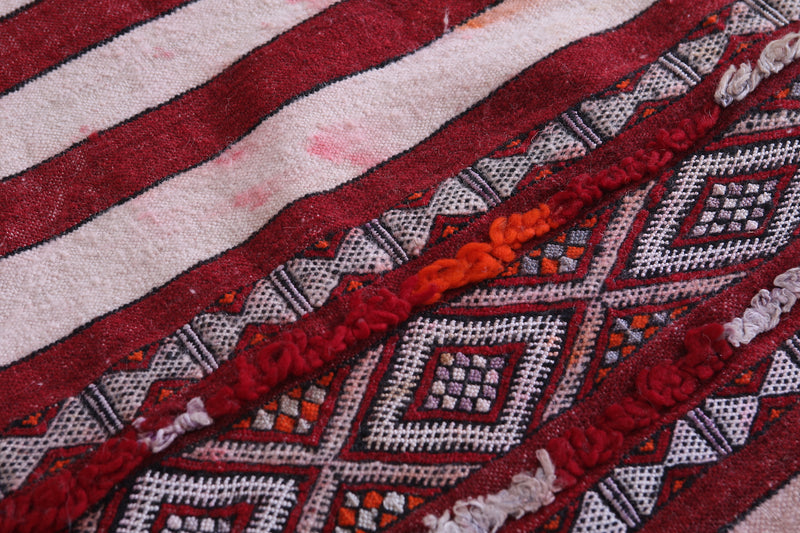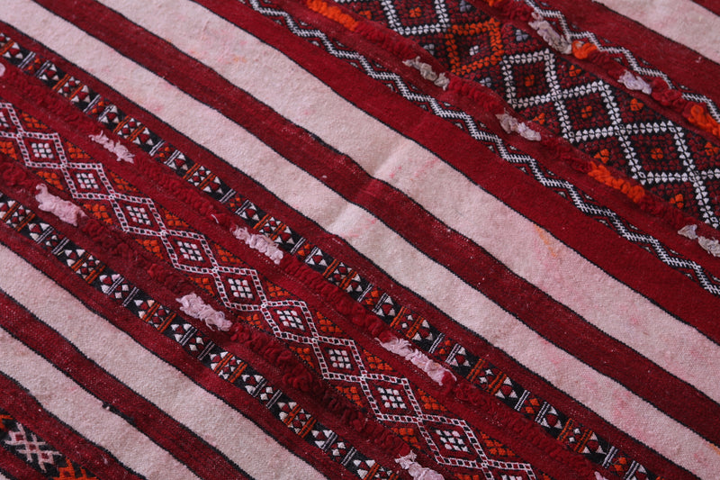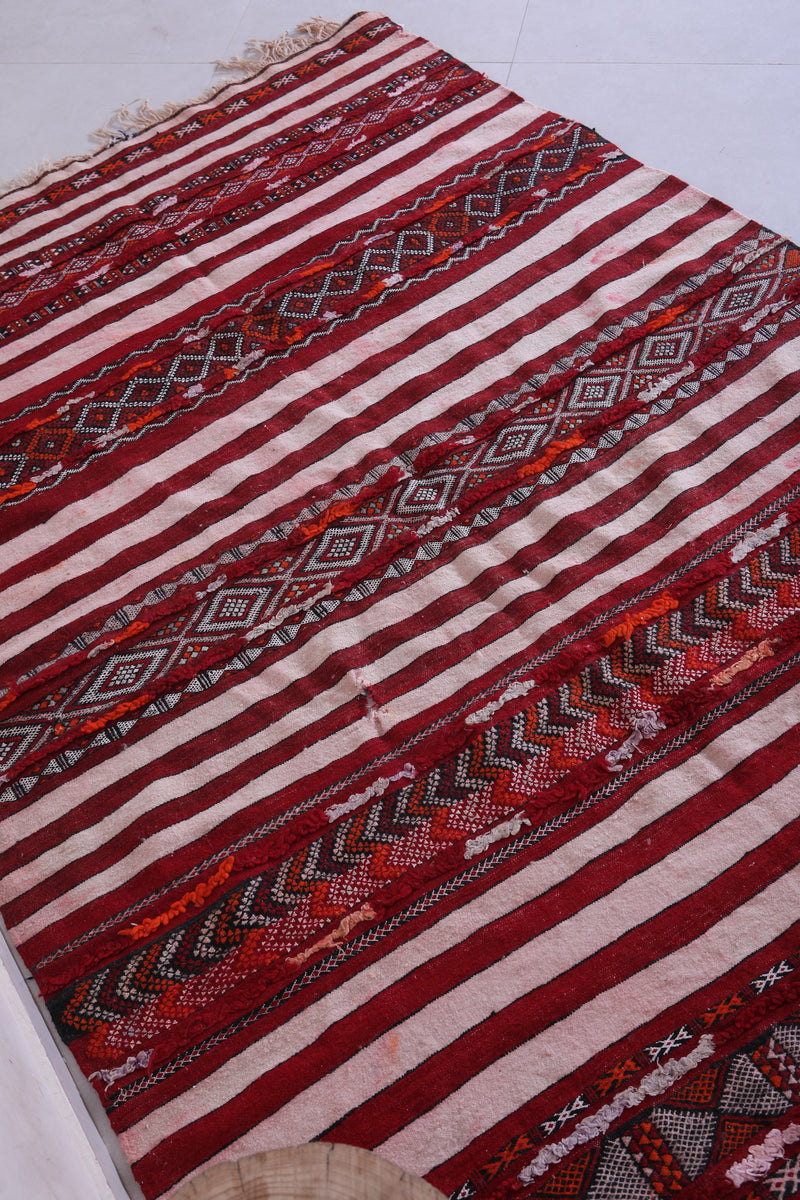 This 4.9 x 7.1 feet vintage Moroccan Kilim rug showcases vibrant red tones and intricate tribal patterns, blending traditional craftsmanship with bohemian charm. Handwoven from premium wool, it offers exceptional durability and softness, making it ideal for living rooms, bedrooms, or dining areas.