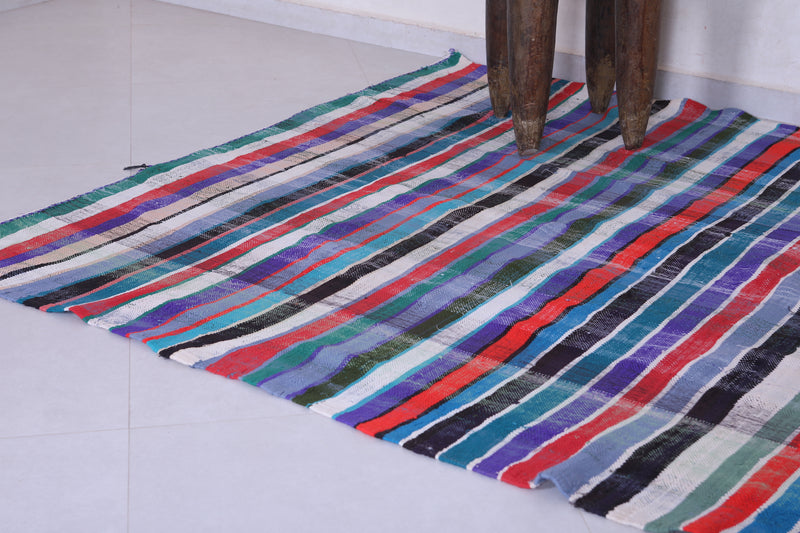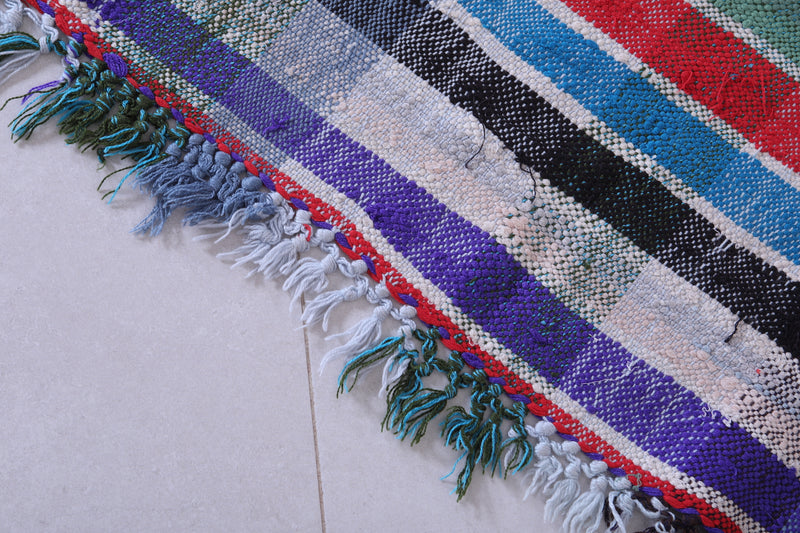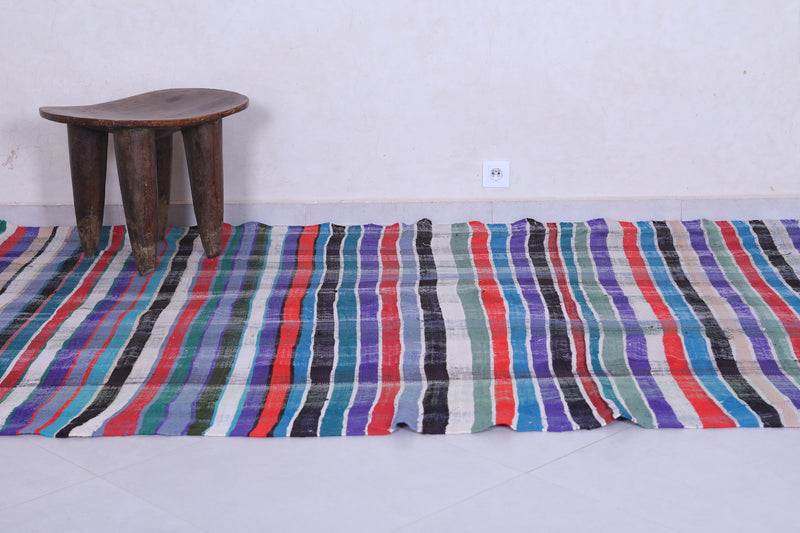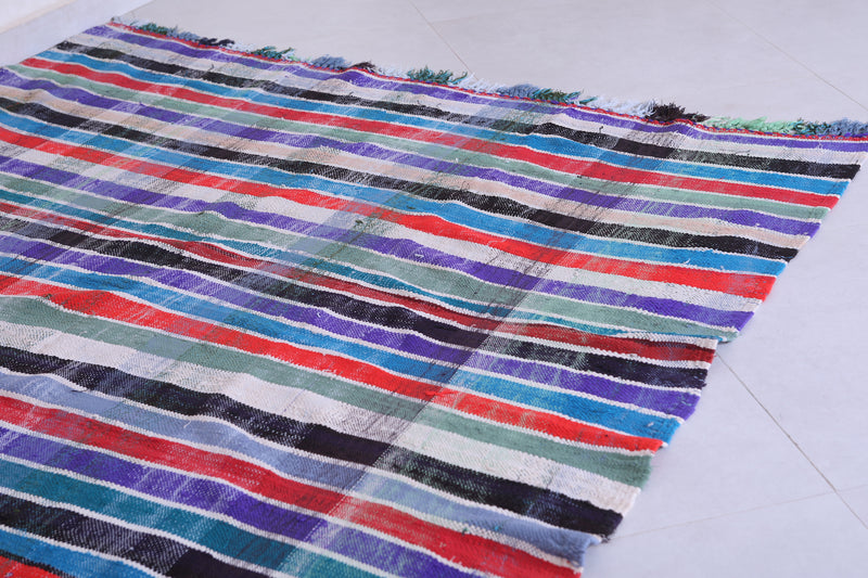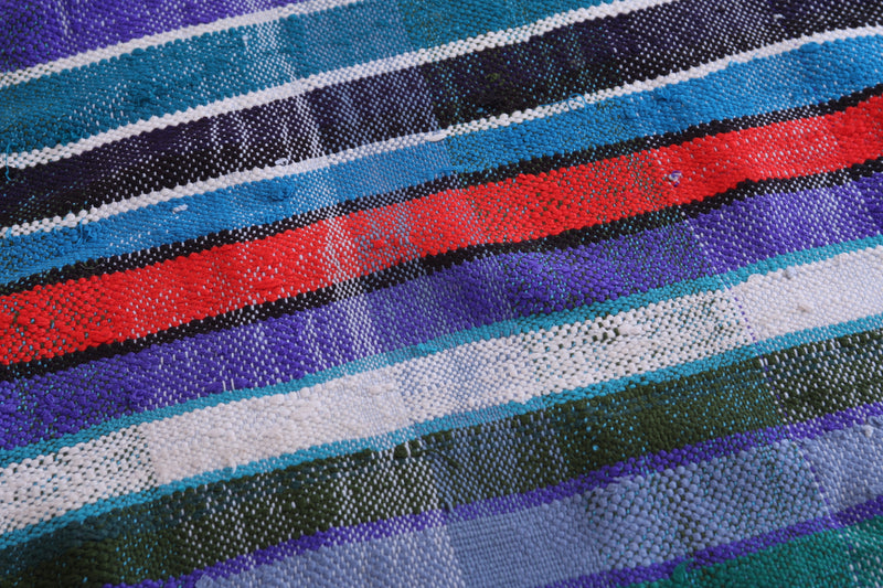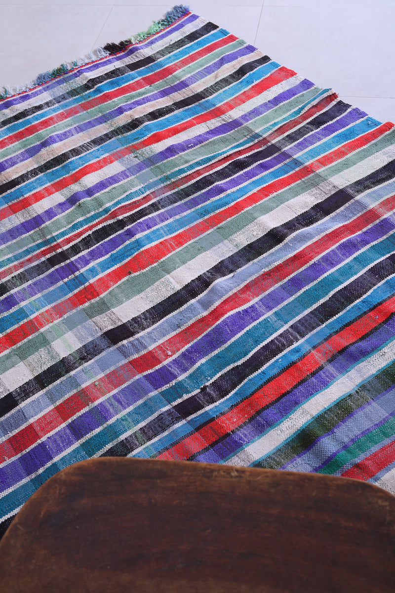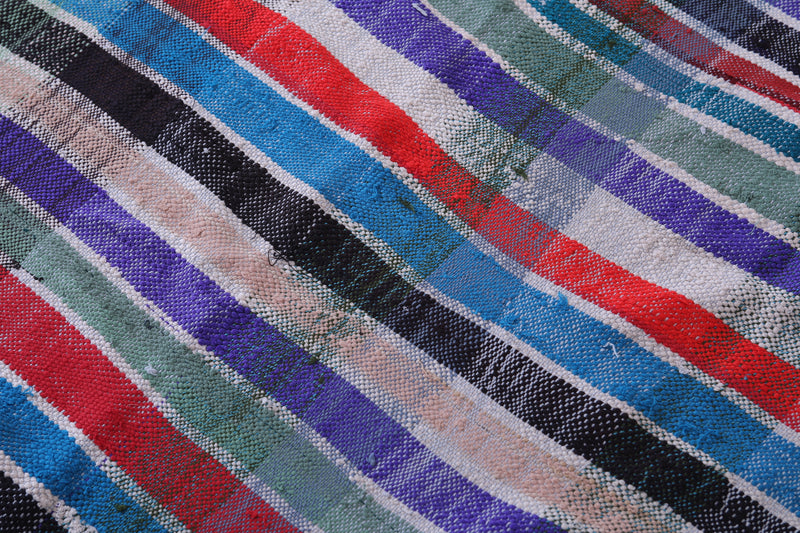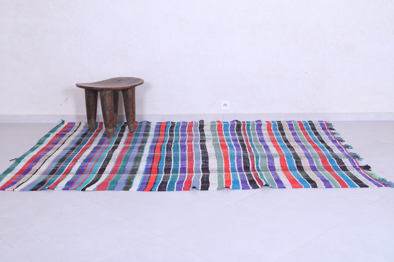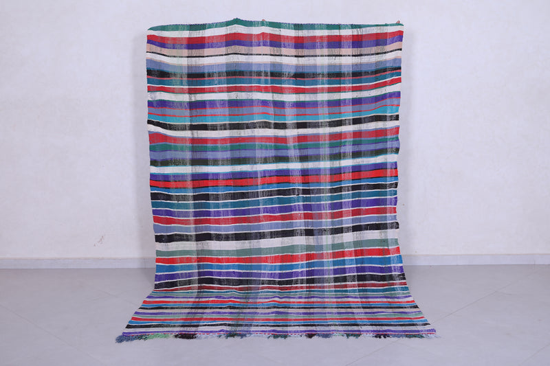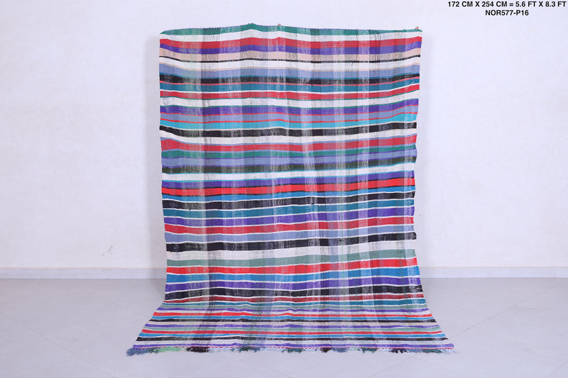 This 5.6 x 8.3 feet vintage Moroccan Kilim rug showcases bold multicolored stripes, blending traditional handwoven craftsmanship with modern artistry. Made from premium wool, it provides exceptional durability and softness, making it ideal for living rooms, bedrooms, or dining areas.