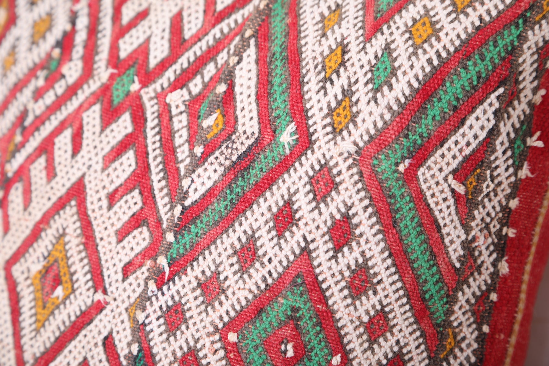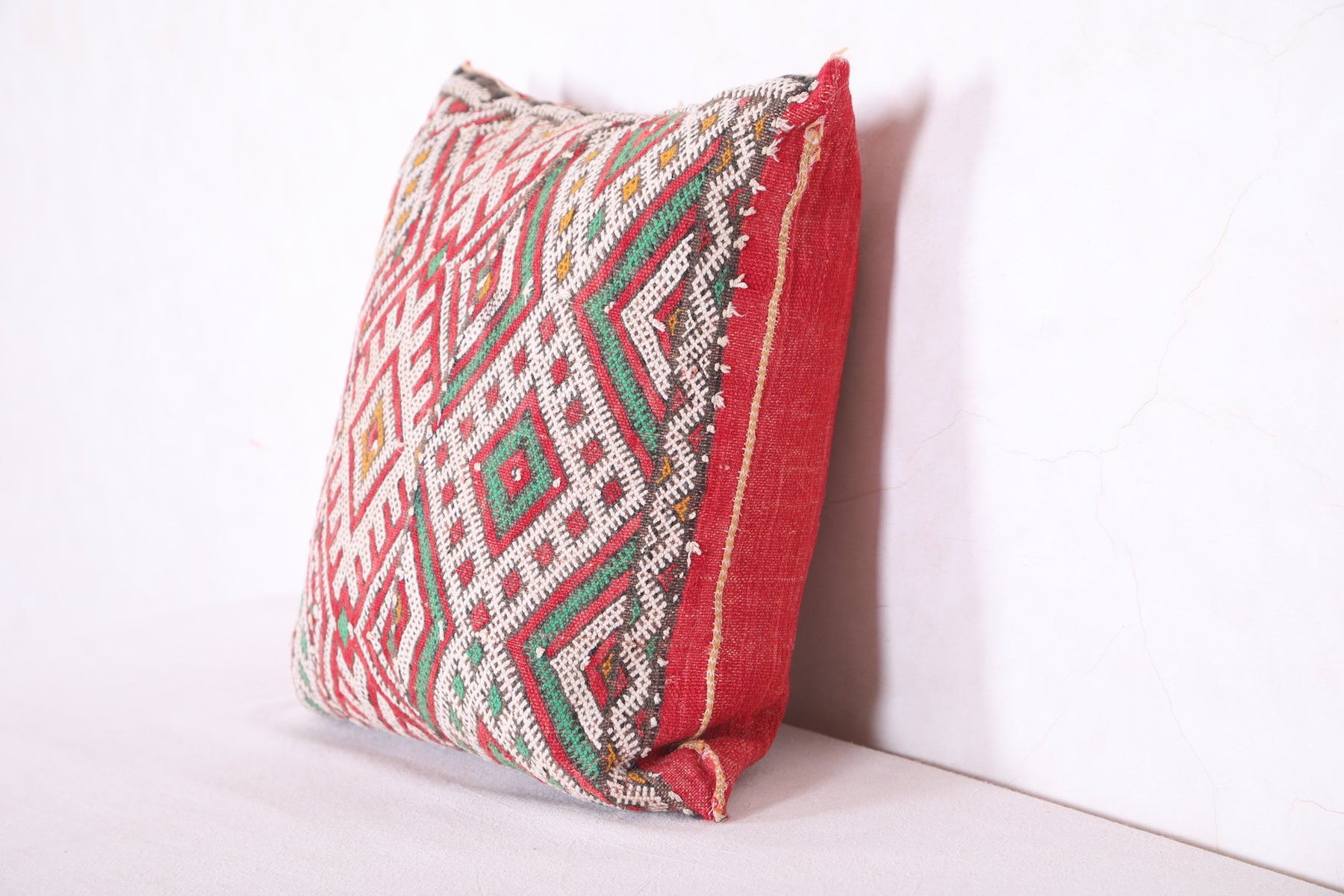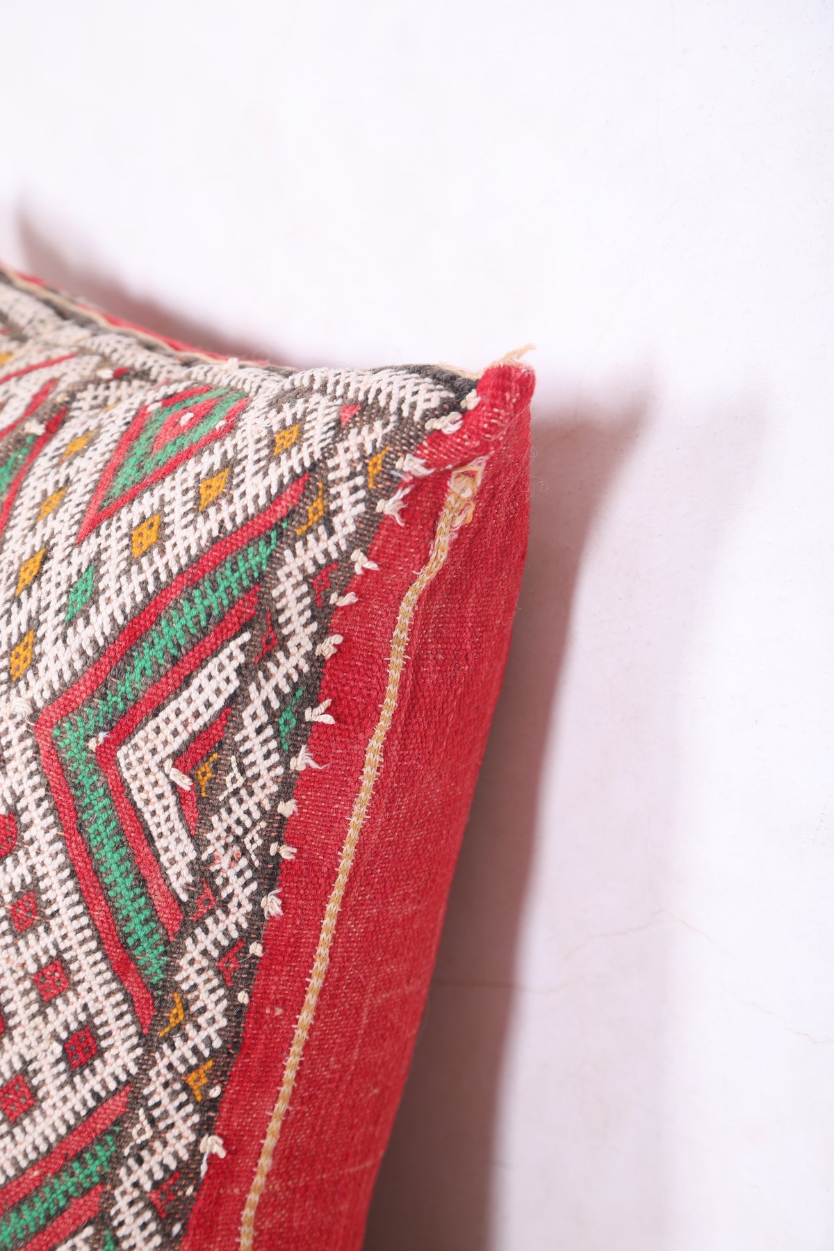 This 15.7 x 17.3 inches Moroccan Pillow Cover bursts with geometric artistry in bold red, green, white, and yellow—handwoven with intricate detail to bring texture and personality to any space. A perfect accent for eclectic, boho, or global-inspired homes.