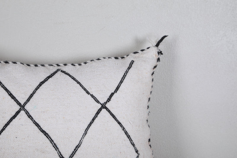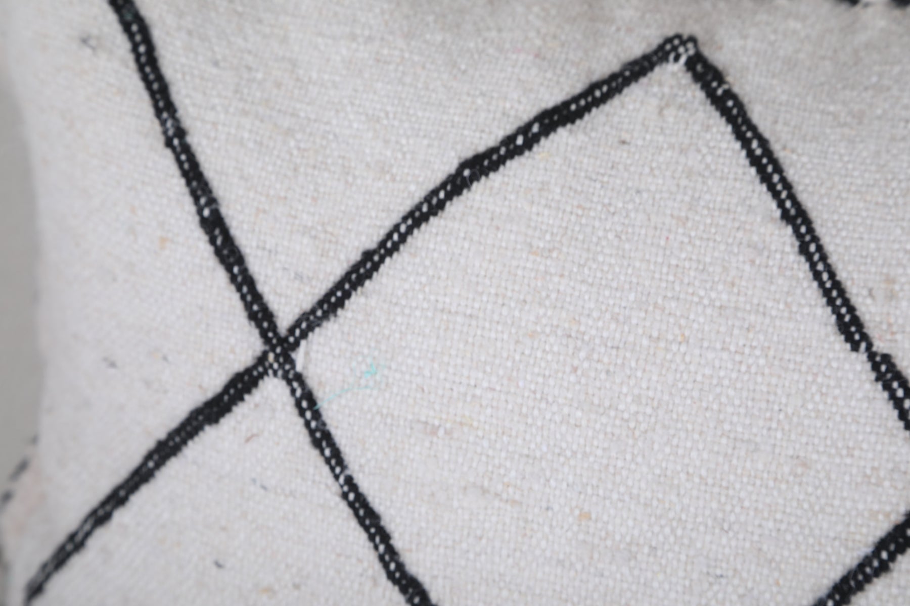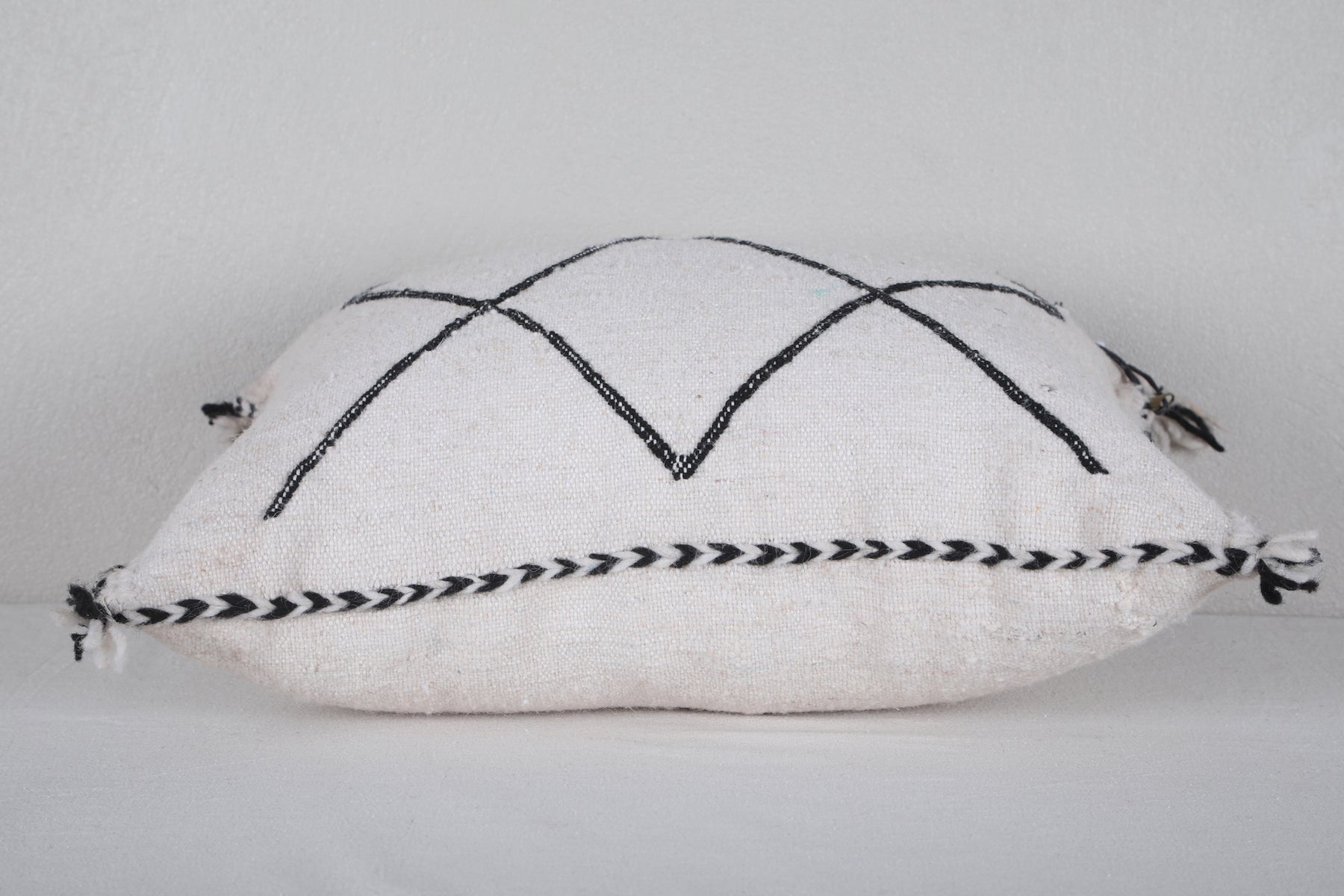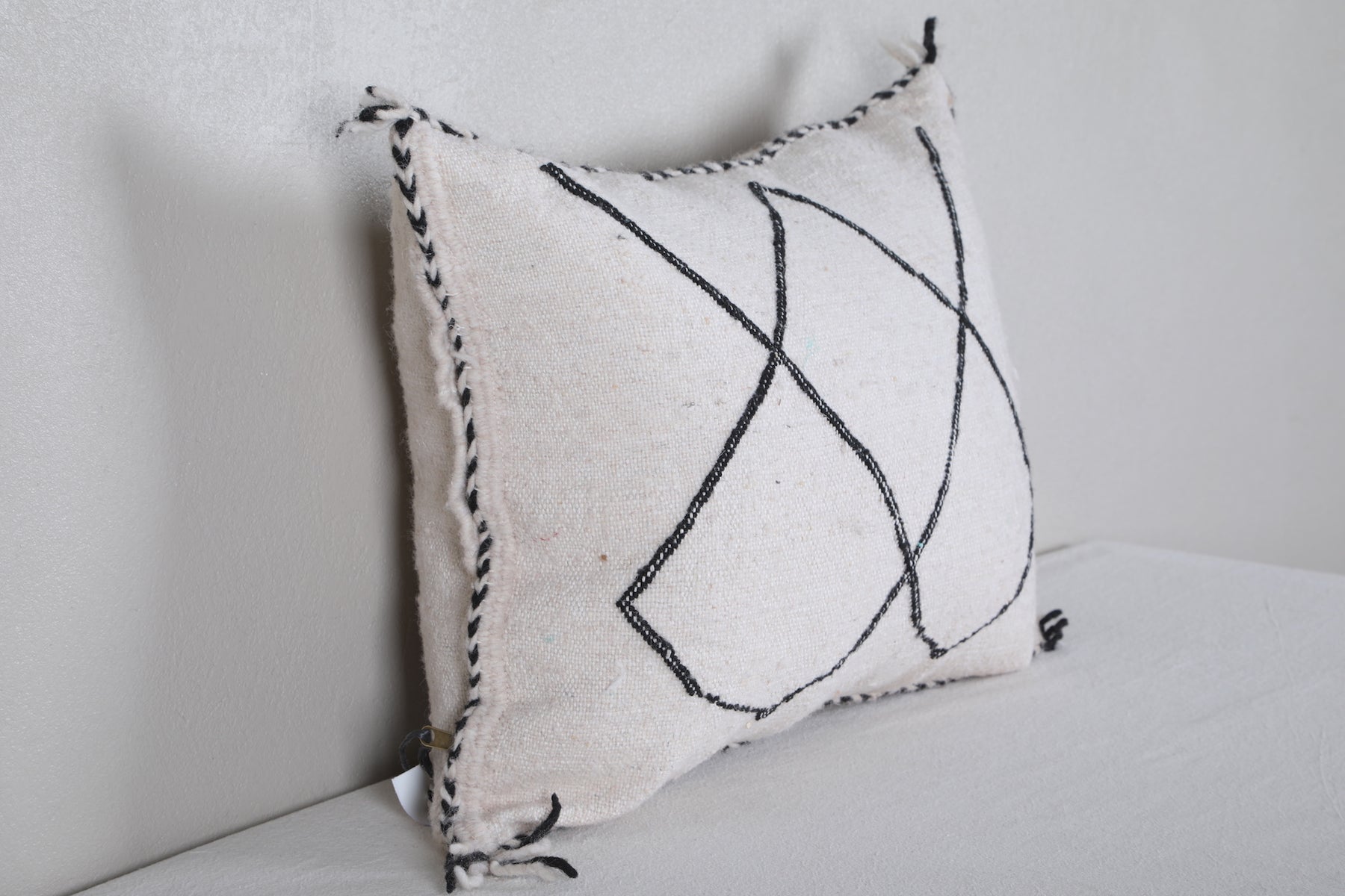 Add timeless elegance and handcrafted charm to your space with this handwoven Moroccan Pillow, sized at 16.1 x 21.2 inches (41 CM x 54 CM). Designed with minimalist black diamond embroidery on a soft ivory background, this pillow brings a touch of understated luxury to any décor, blending effortlessly with both modern and bohemian styles.
