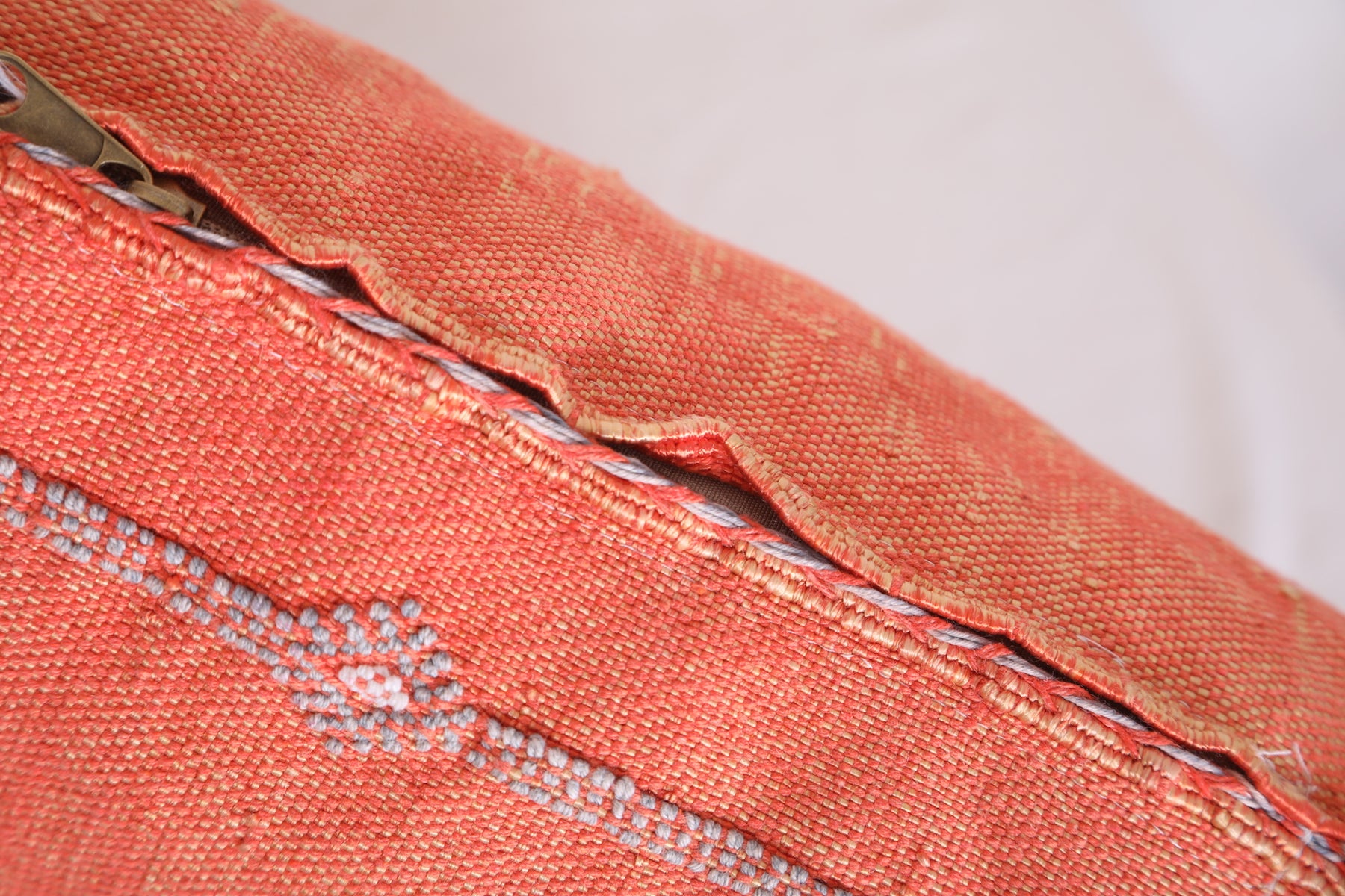 Expertly woven from vintage wool and cotton textiles, this pillow features a vibrant peachy-orange background adorned with intricate white and green Berber embroidery, adding authentic Moroccan charm to your space. Each pillow is one-of-a-kind, making it a unique expression of craftsmanship and culture.