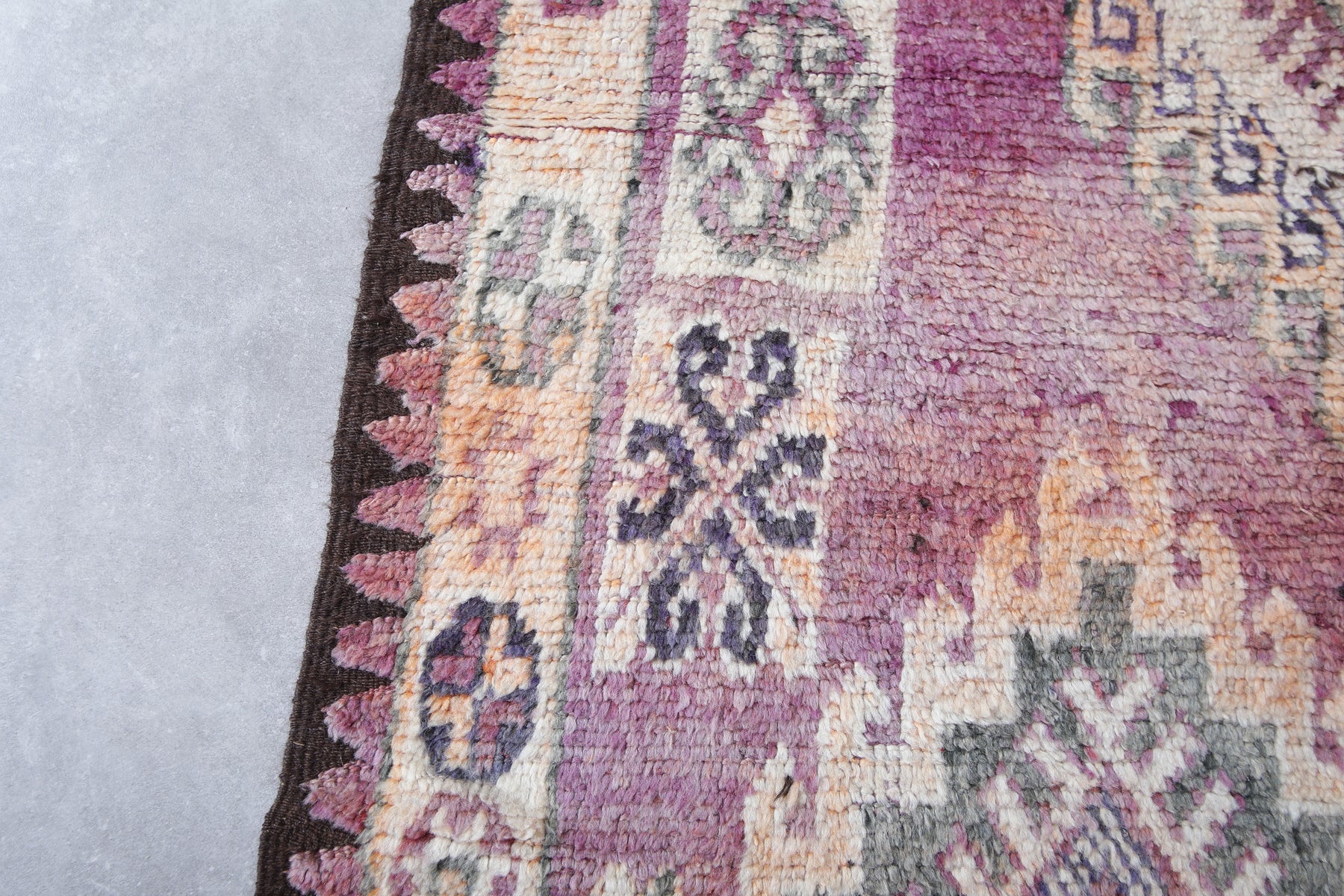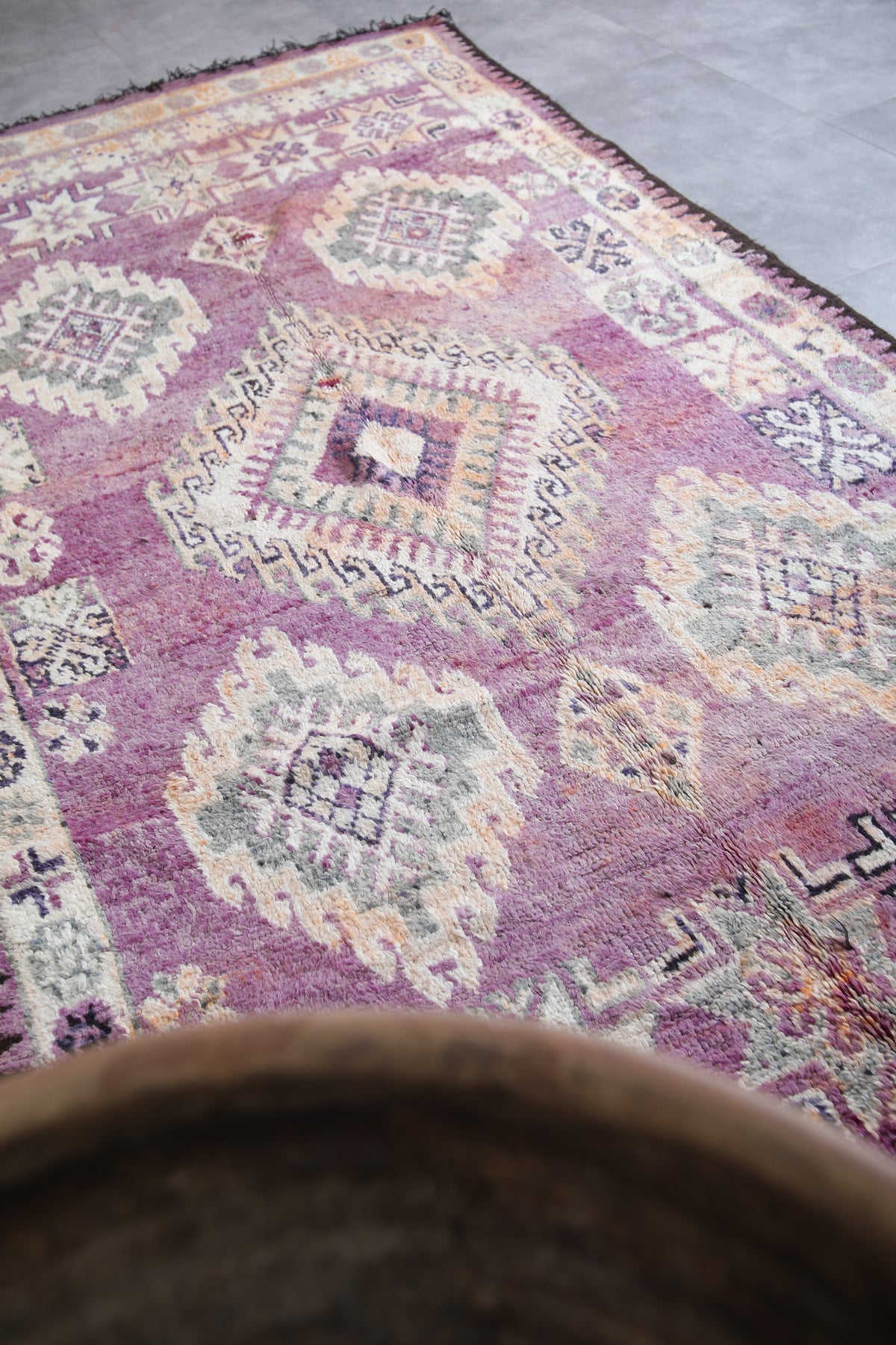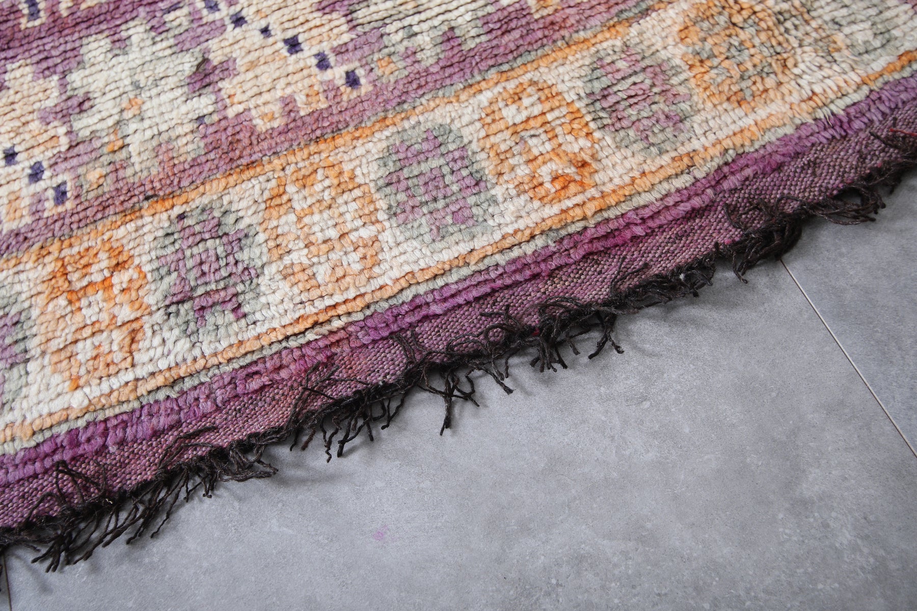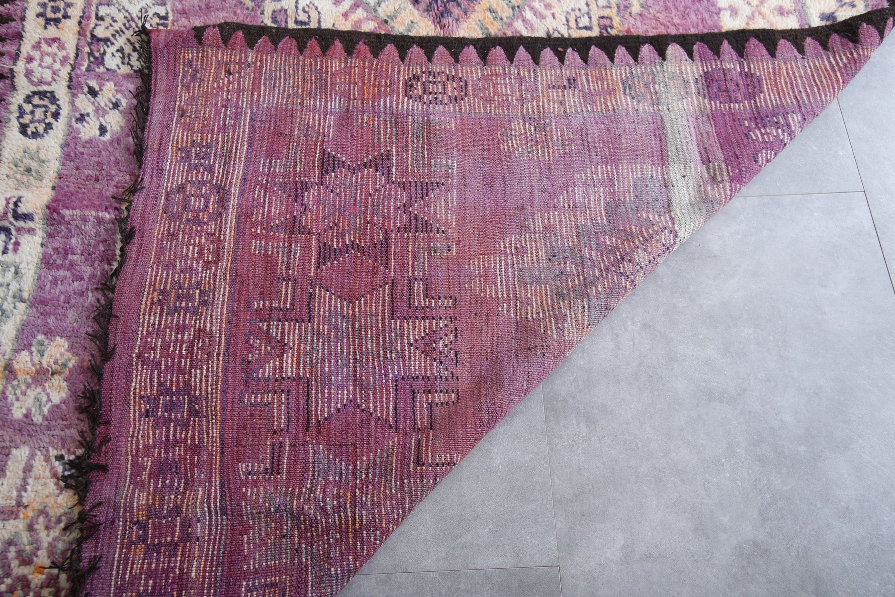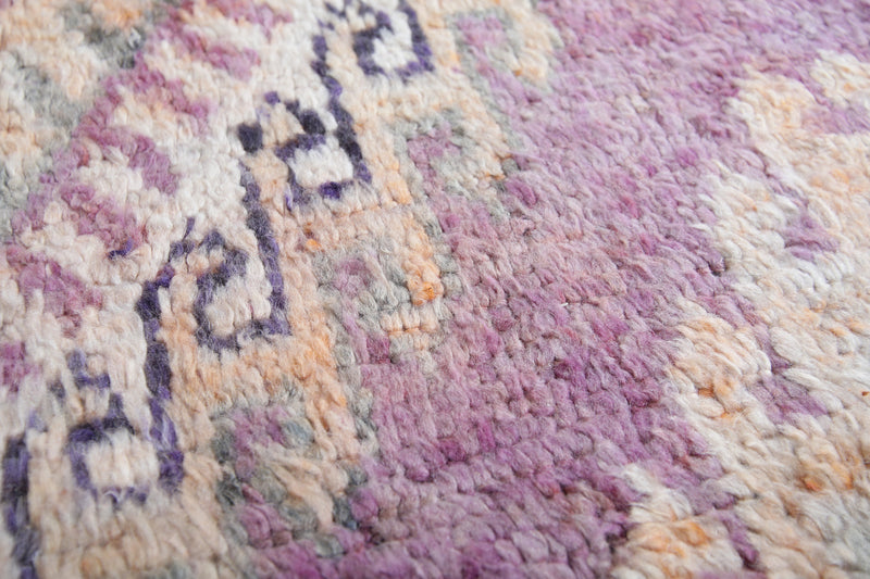 Enhance your space with this exquisite vintage Moroccan rug, featuring a captivating array of geometric designs and intricate patterns. The center displays a bold diamond motif surrounded by smaller, complementary diamond shapes, symbolizing harmony and balance. The border boasts a series of star-like patterns and traditional Berber-inspired motifs, adding a touch of cultural authenticity. With its vibrant palette of purple, peach, and earthy tones, this rug creates a warm and inviting atmosphere. Meticulously handcrafted, this piece is both a functional and artistic addition to any room. Perfect for living rooms, bedrooms, or as a statement piece in large spaces.
