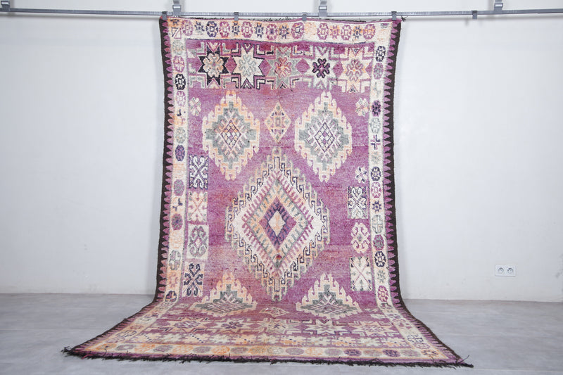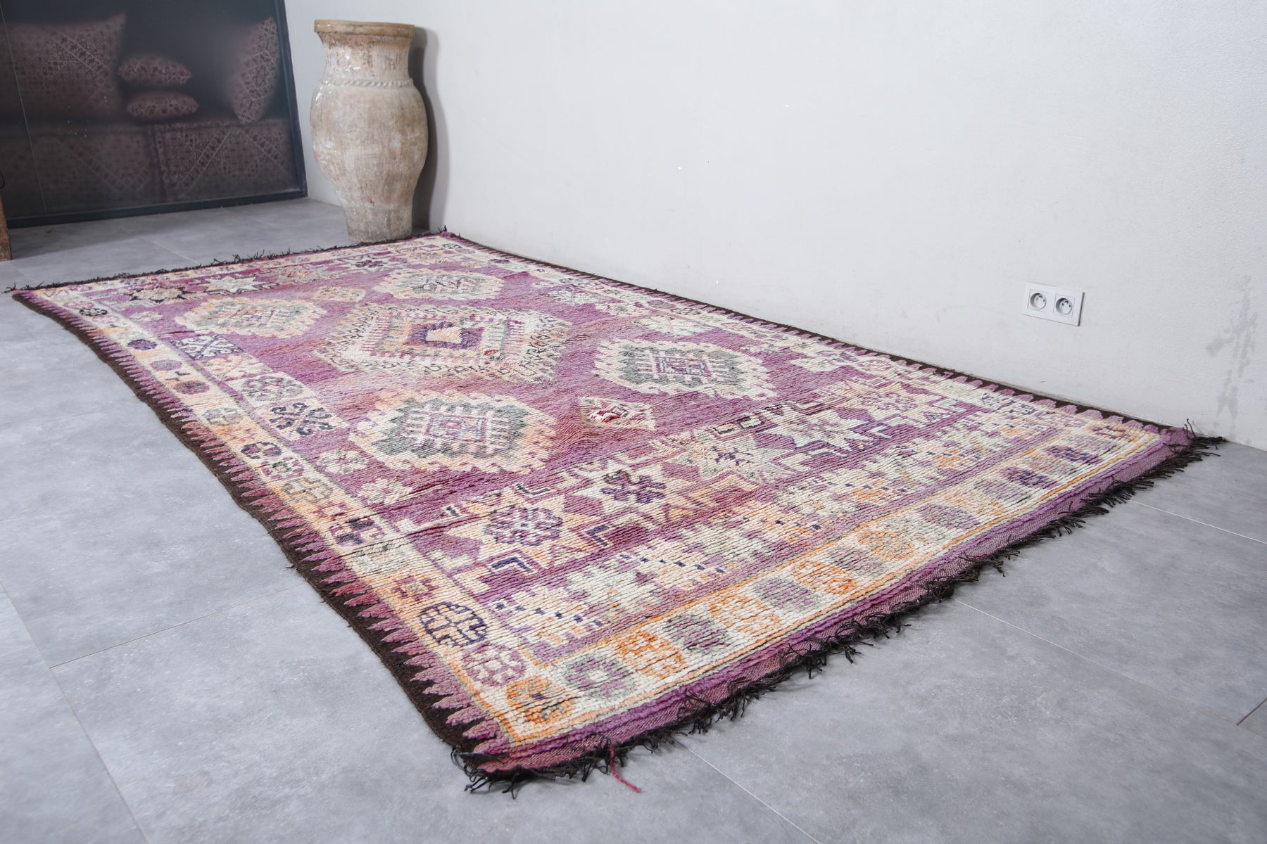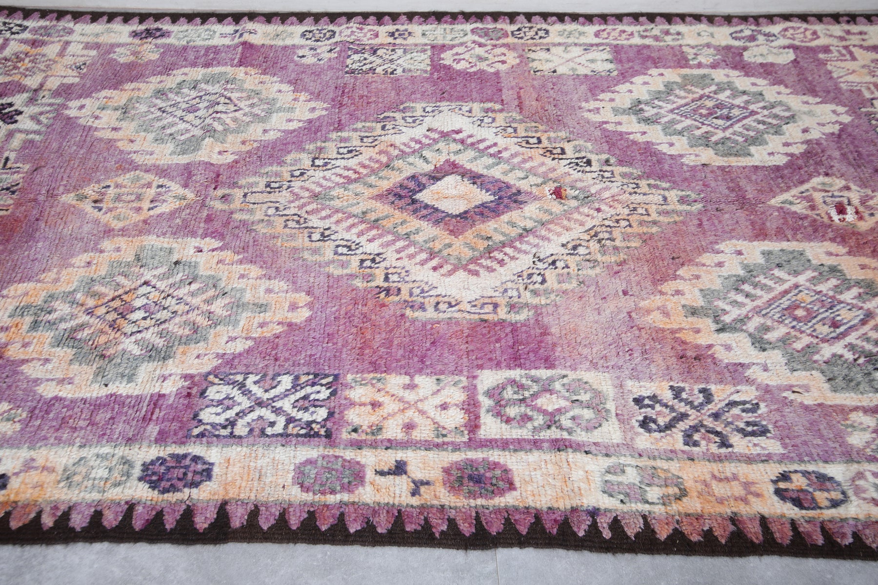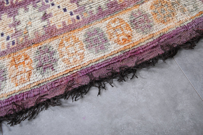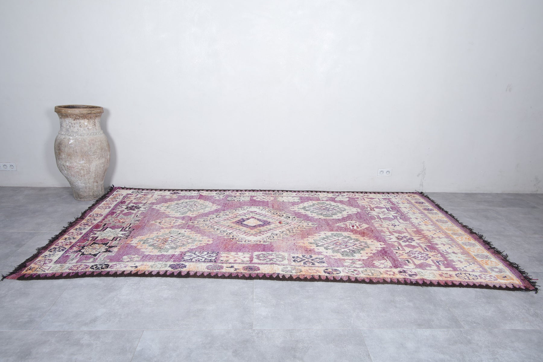 Enhance your space with this exquisite vintage Moroccan rug, featuring a captivating array of geometric designs and intricate patterns. The center displays a bold diamond motif surrounded by smaller, complementary diamond shapes, symbolizing harmony and balance. The border boasts a series of star-like patterns and traditional Berber-inspired motifs, adding a touch of cultural authenticity. With its vibrant palette of purple, peach, and earthy tones, this rug creates a warm and inviting atmosphere. Meticulously handcrafted, this piece is both a functional and artistic addition to any room. Perfect for living rooms, bedrooms, or as a statement piece in large spaces.