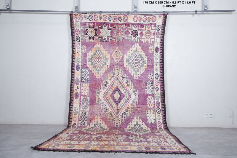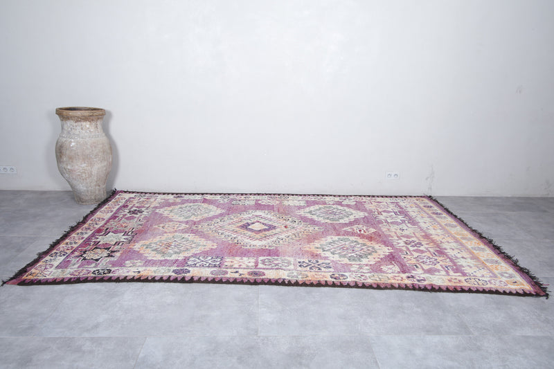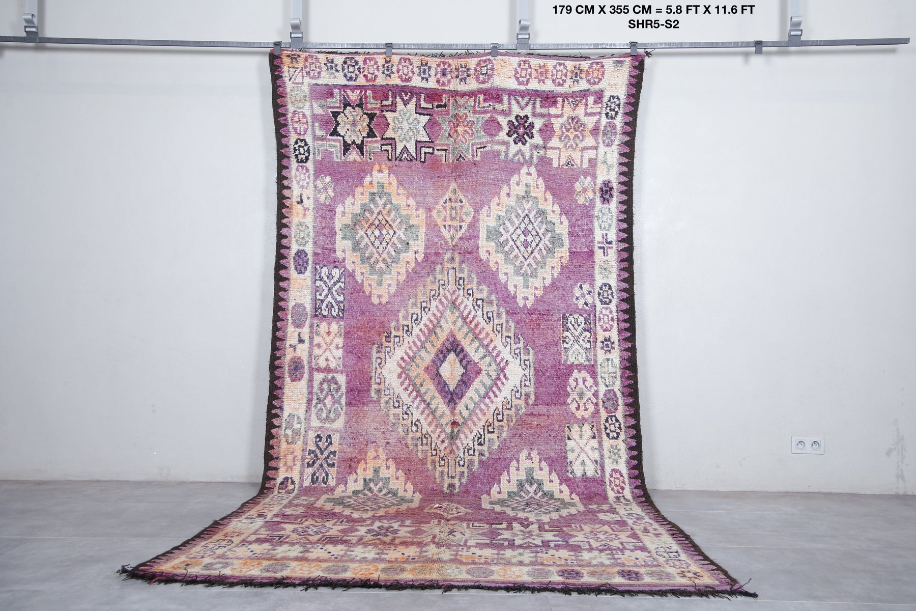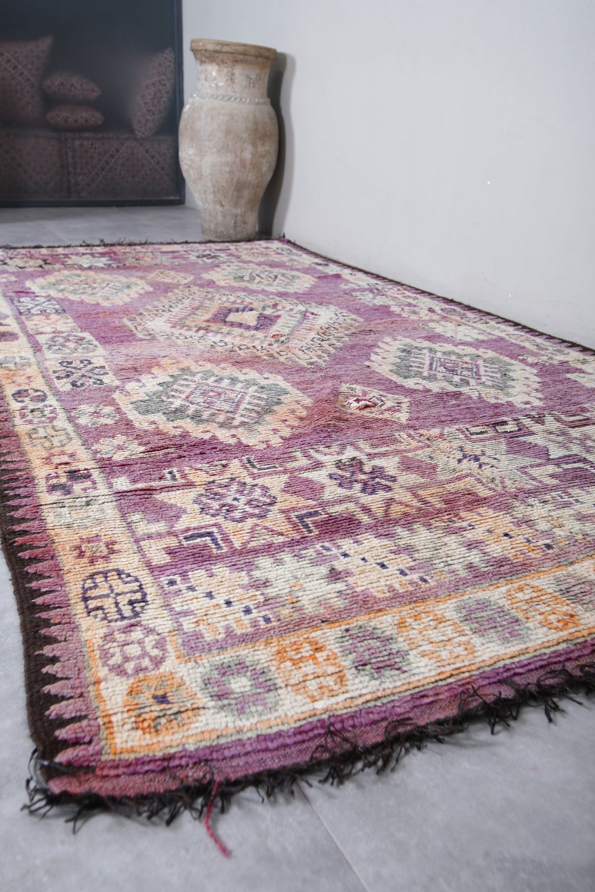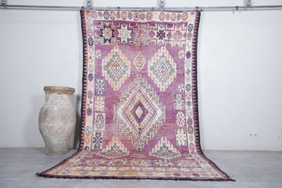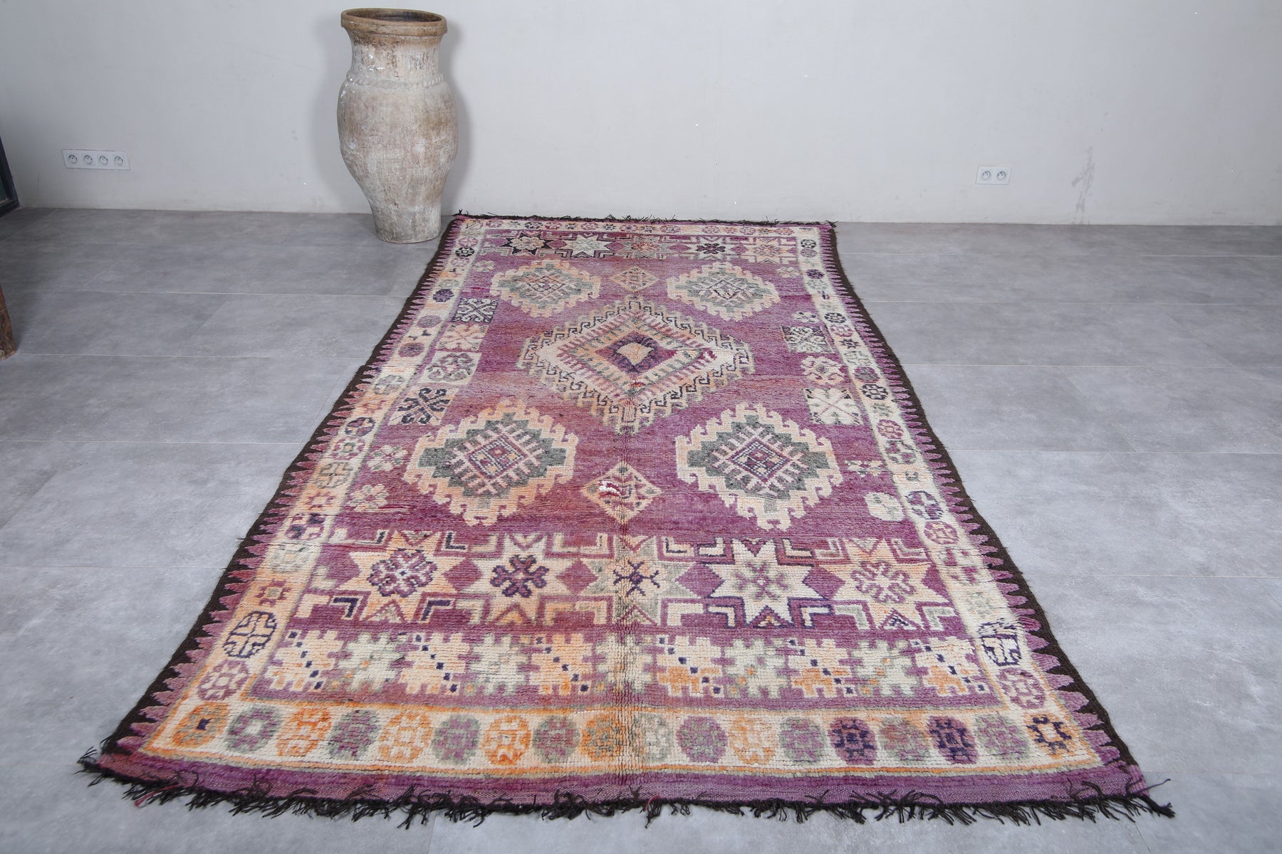Enhance your space with this exquisite vintage Moroccan rug, featuring a captivating array of geometric designs and intricate patterns. The center displays a bold diamond motif surrounded by smaller, complementary diamond shapes, symbolizing harmony and balance. The border boasts a series of star-like patterns and traditional Berber-inspired motifs, adding a touch of cultural authenticity. With its vibrant palette of purple, peach, and earthy tones, this rug creates a warm and inviting atmosphere. Meticulously handcrafted, this piece is both a functional and artistic addition to any room. Perfect for living rooms, bedrooms, or as a statement piece in large spaces.