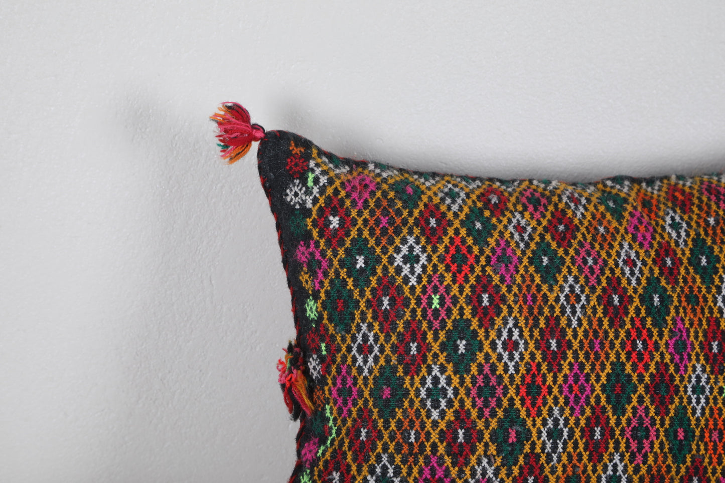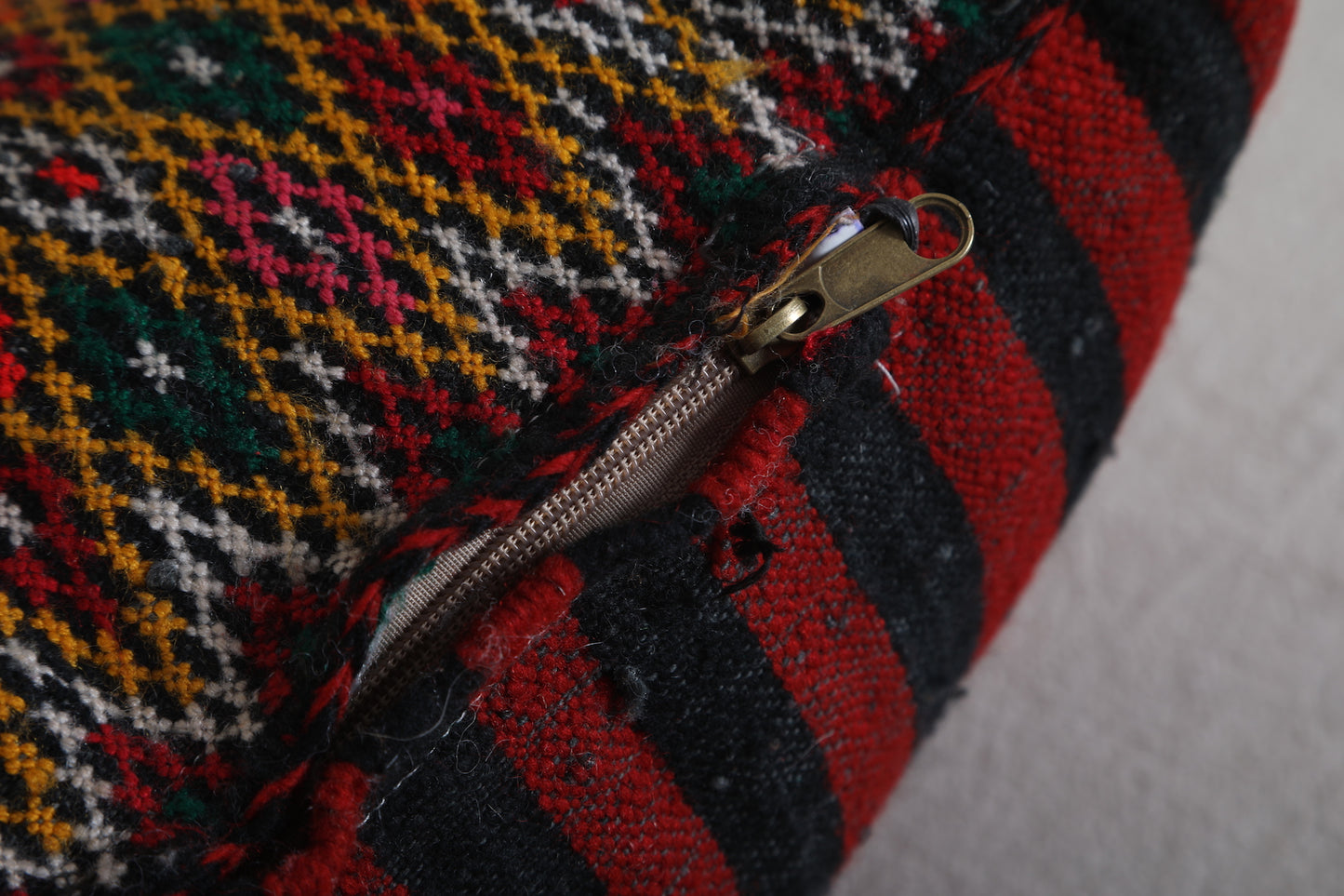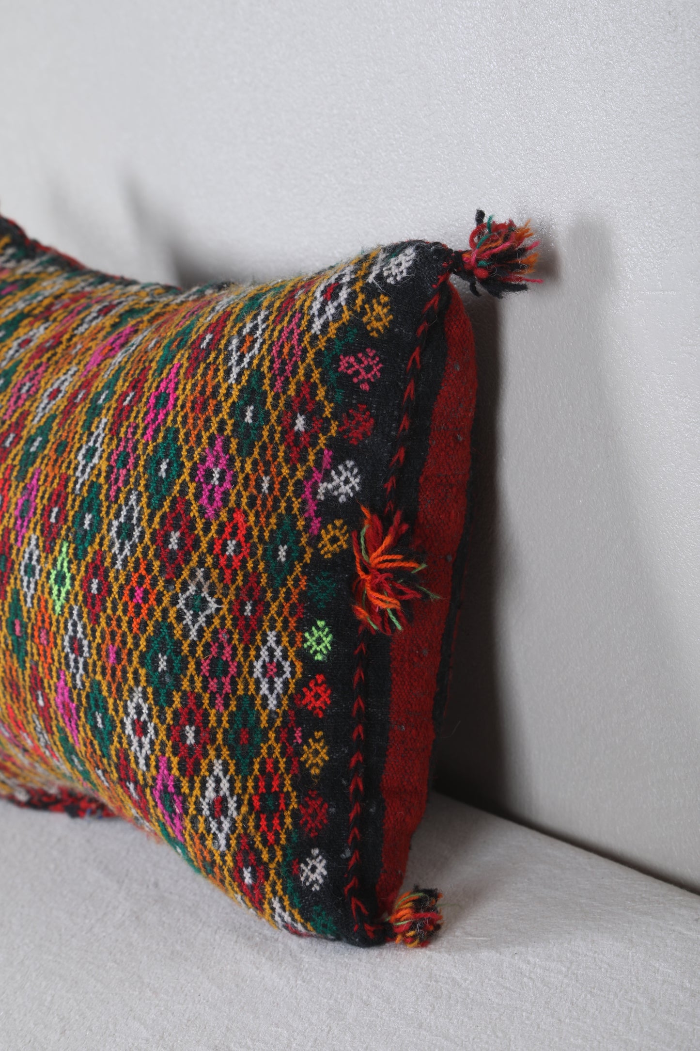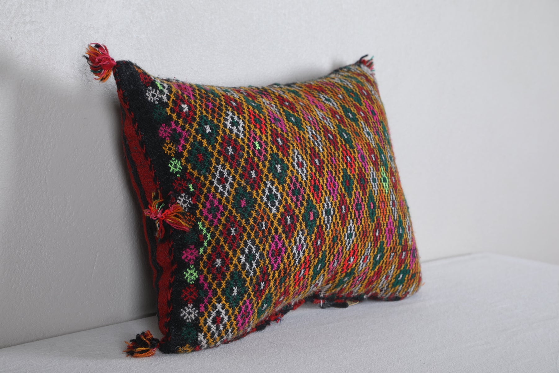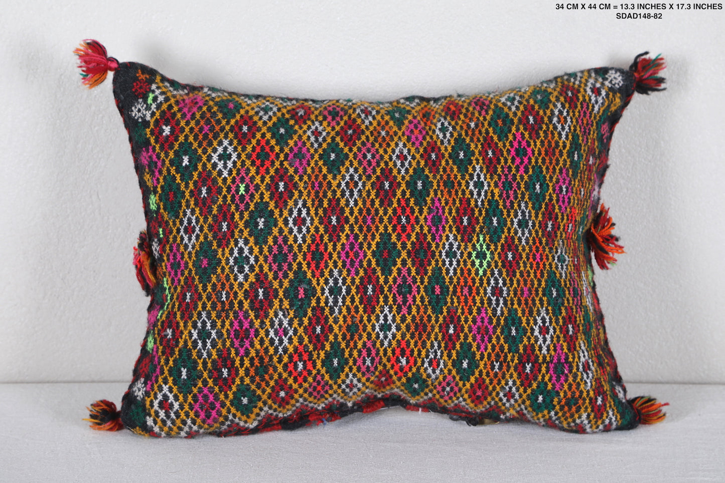 This vintage tribal pillow is perfect for adding a Moroccan touch to any room. Crafted with 100% wool and cotton materials, it measures 13.3 inches by 17.3 inches, offering a unique and traditional look to your decor.