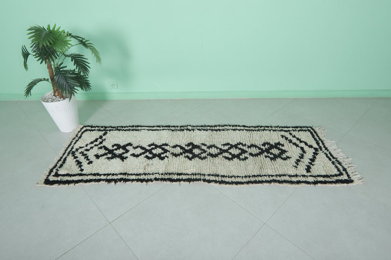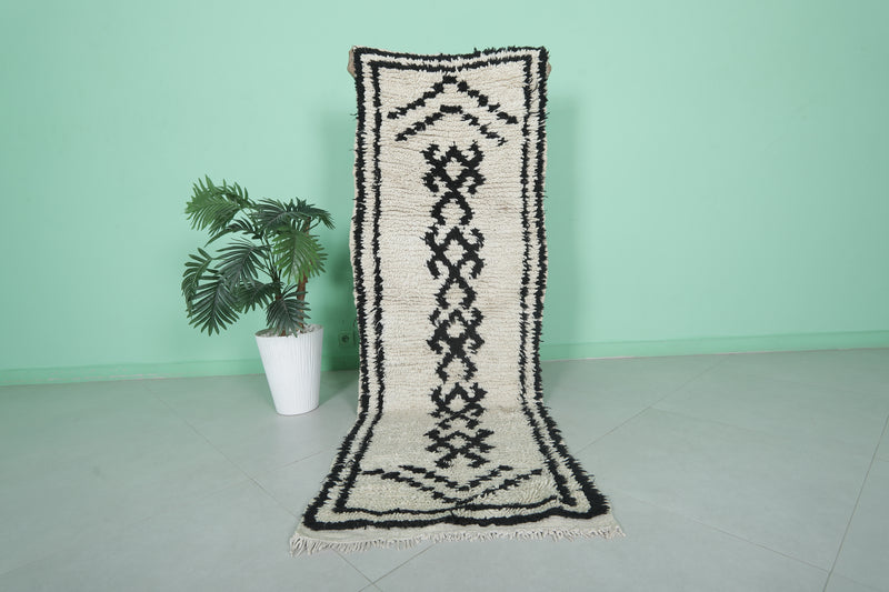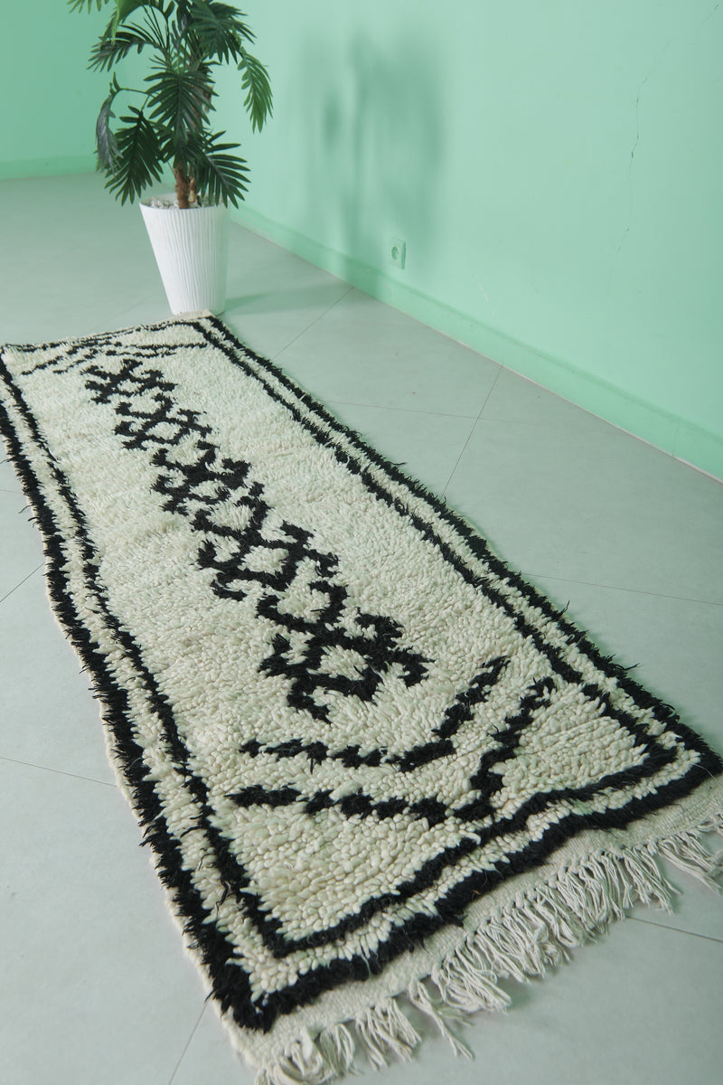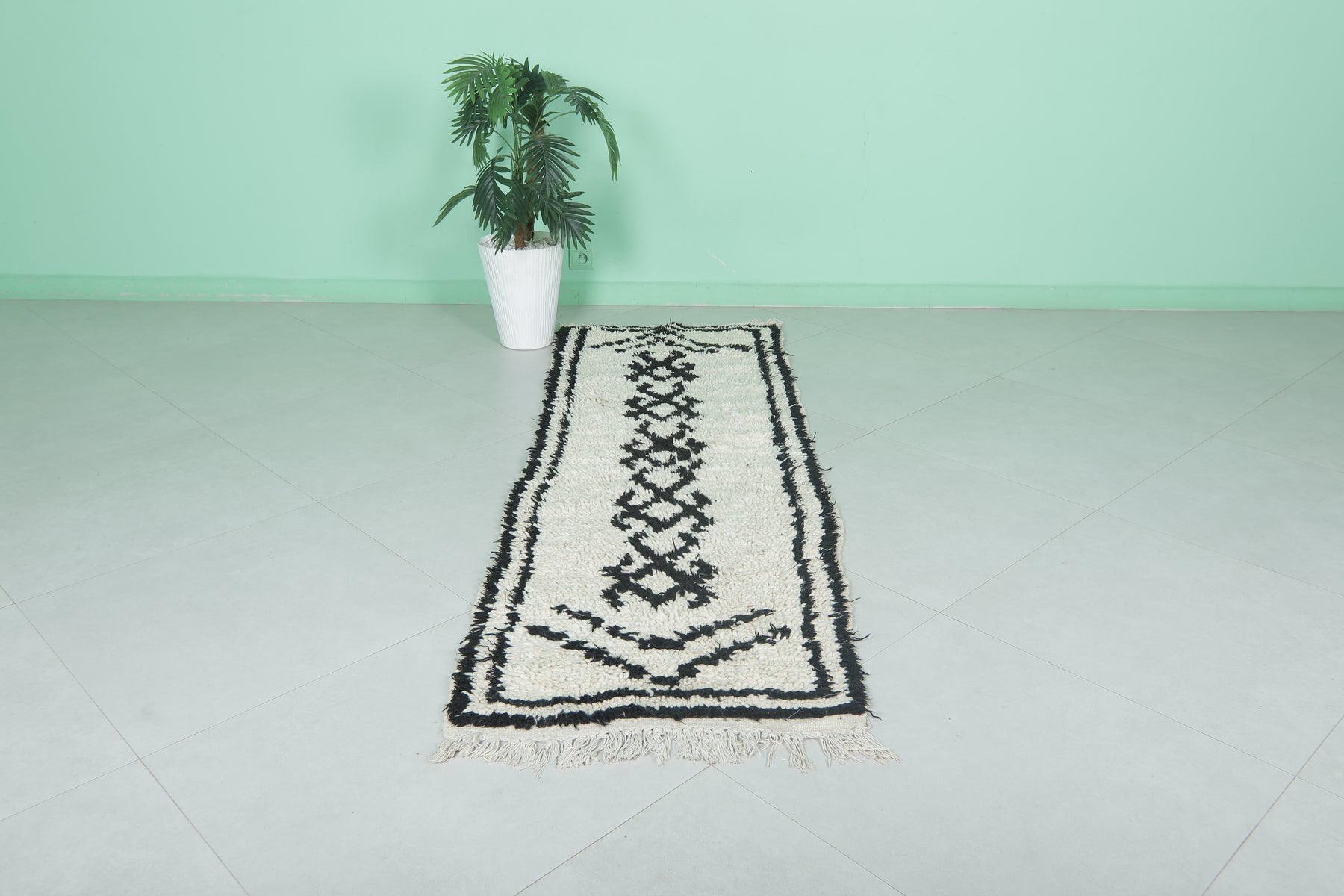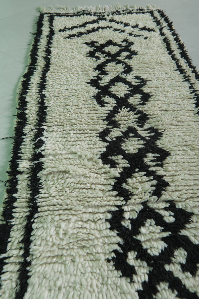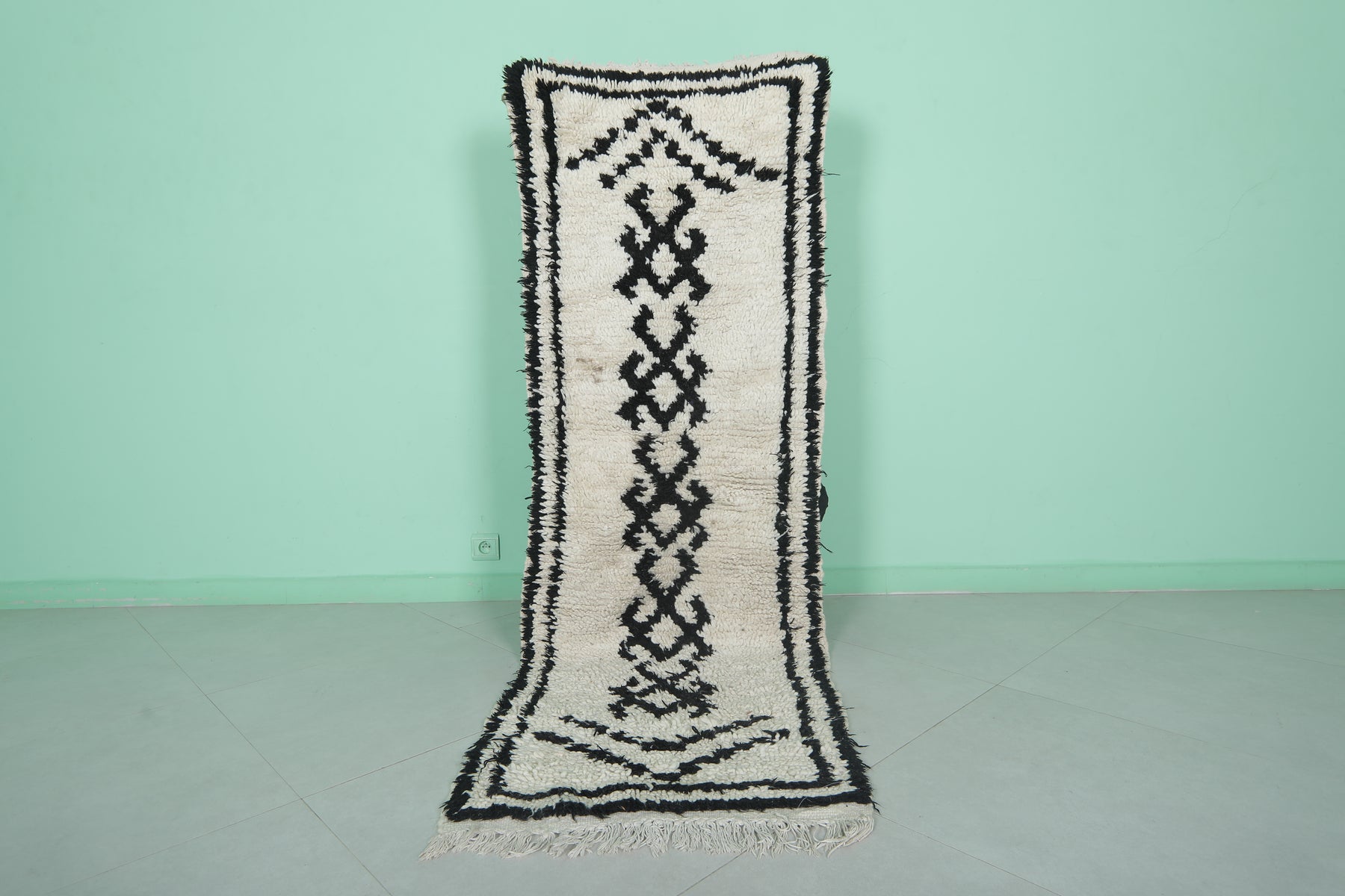 Bring timeless tradition to your hallway with this Vintage Moroccan Runner Rug (2.2 x 6.6 FT), showcasing bold black Berber motifs centered on a creamy ivory background.