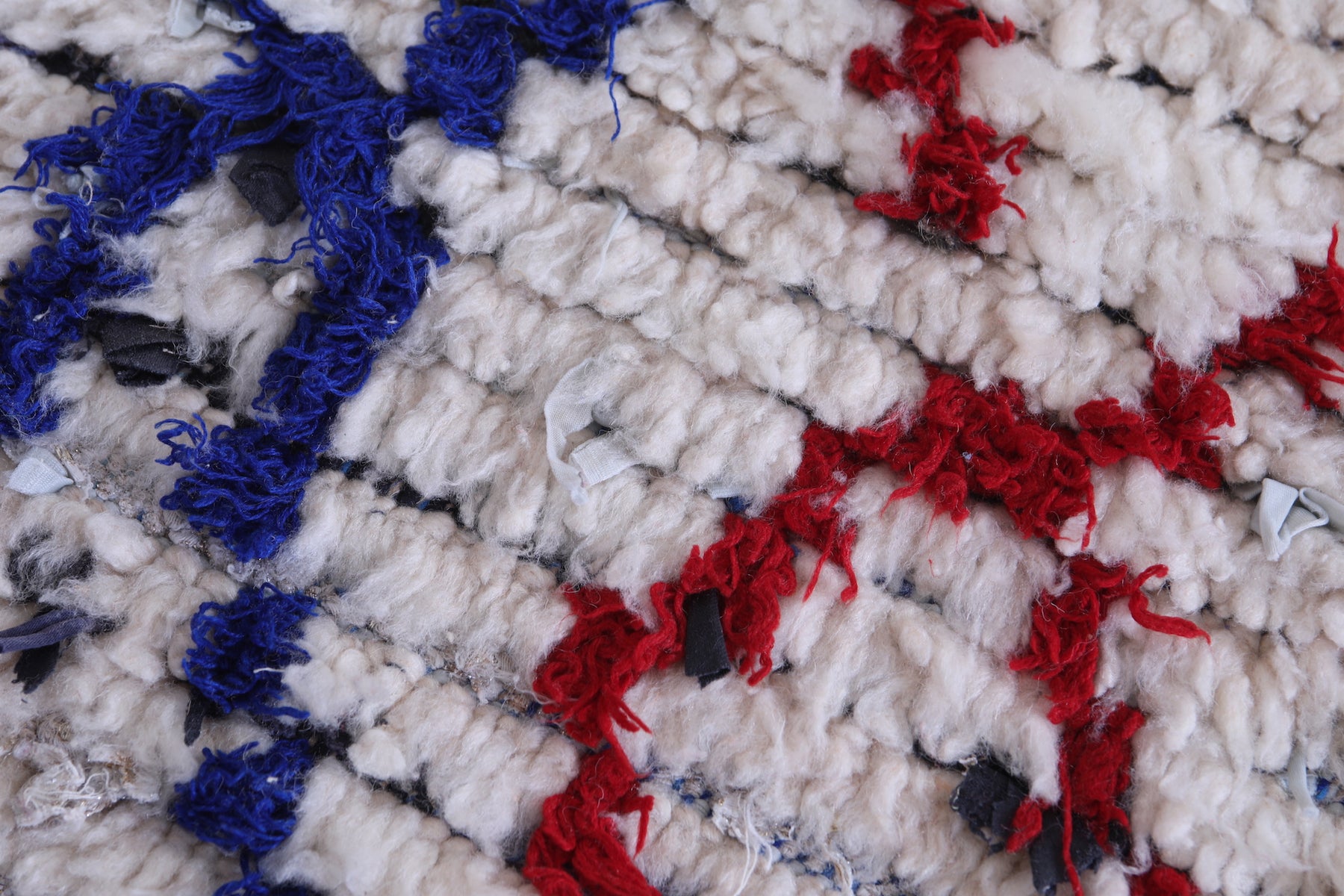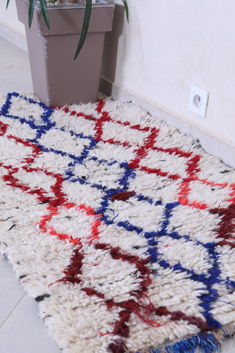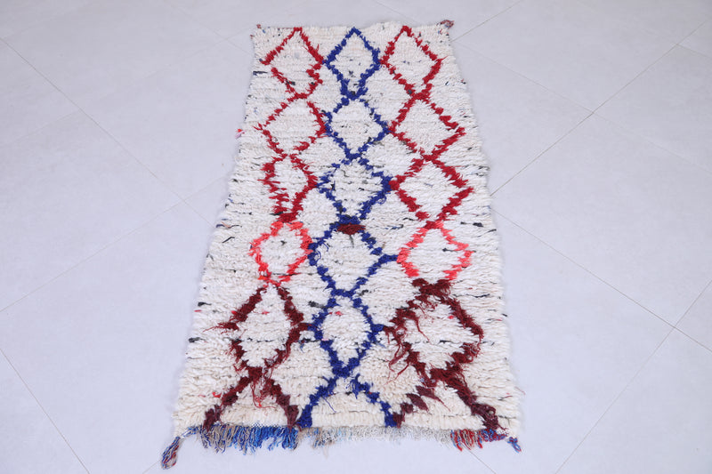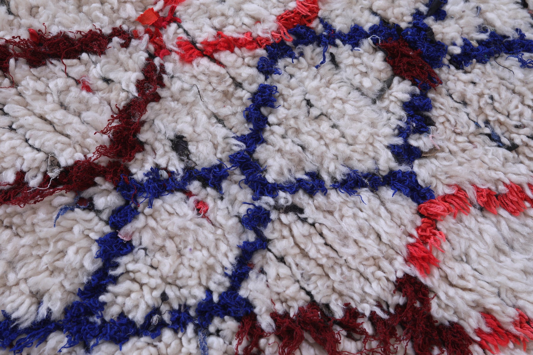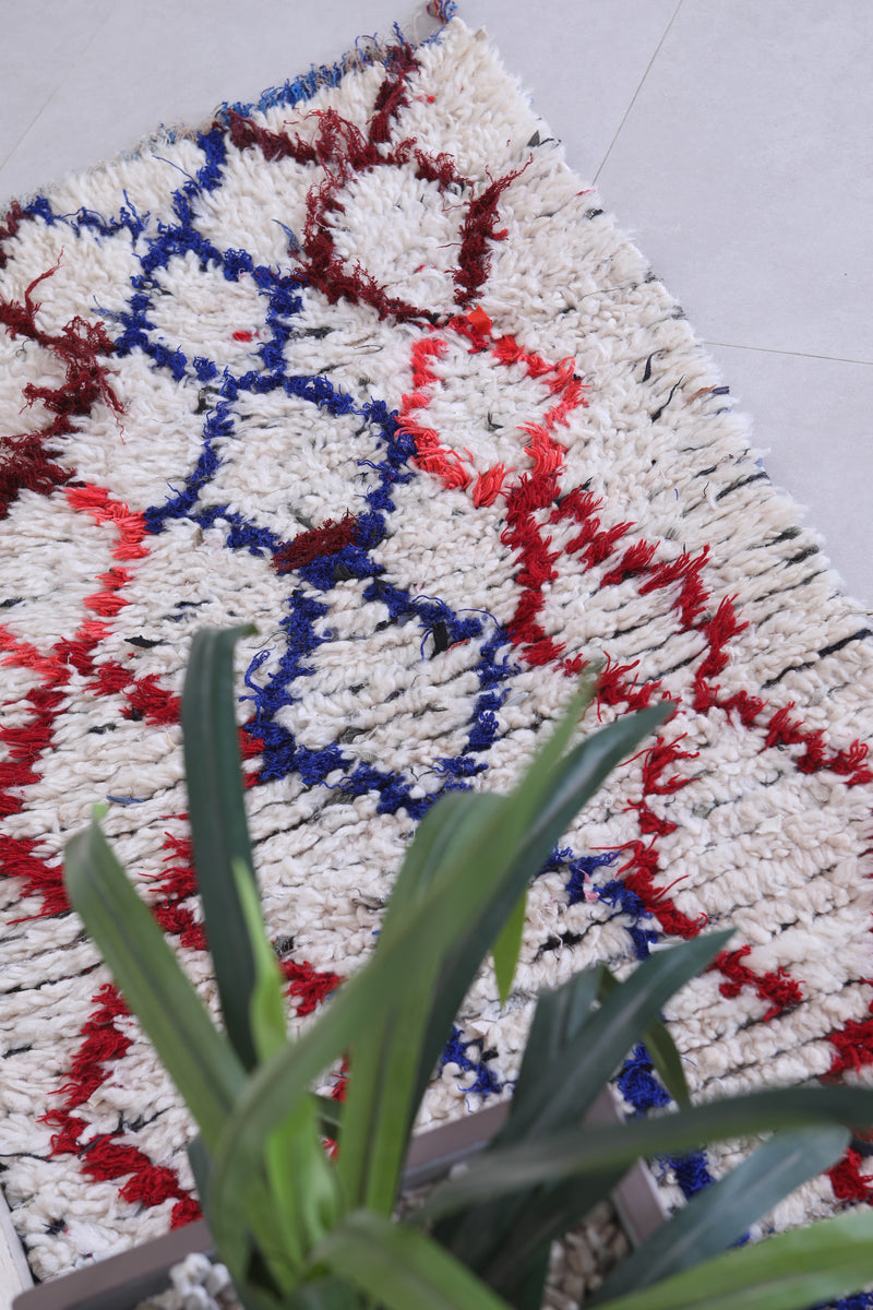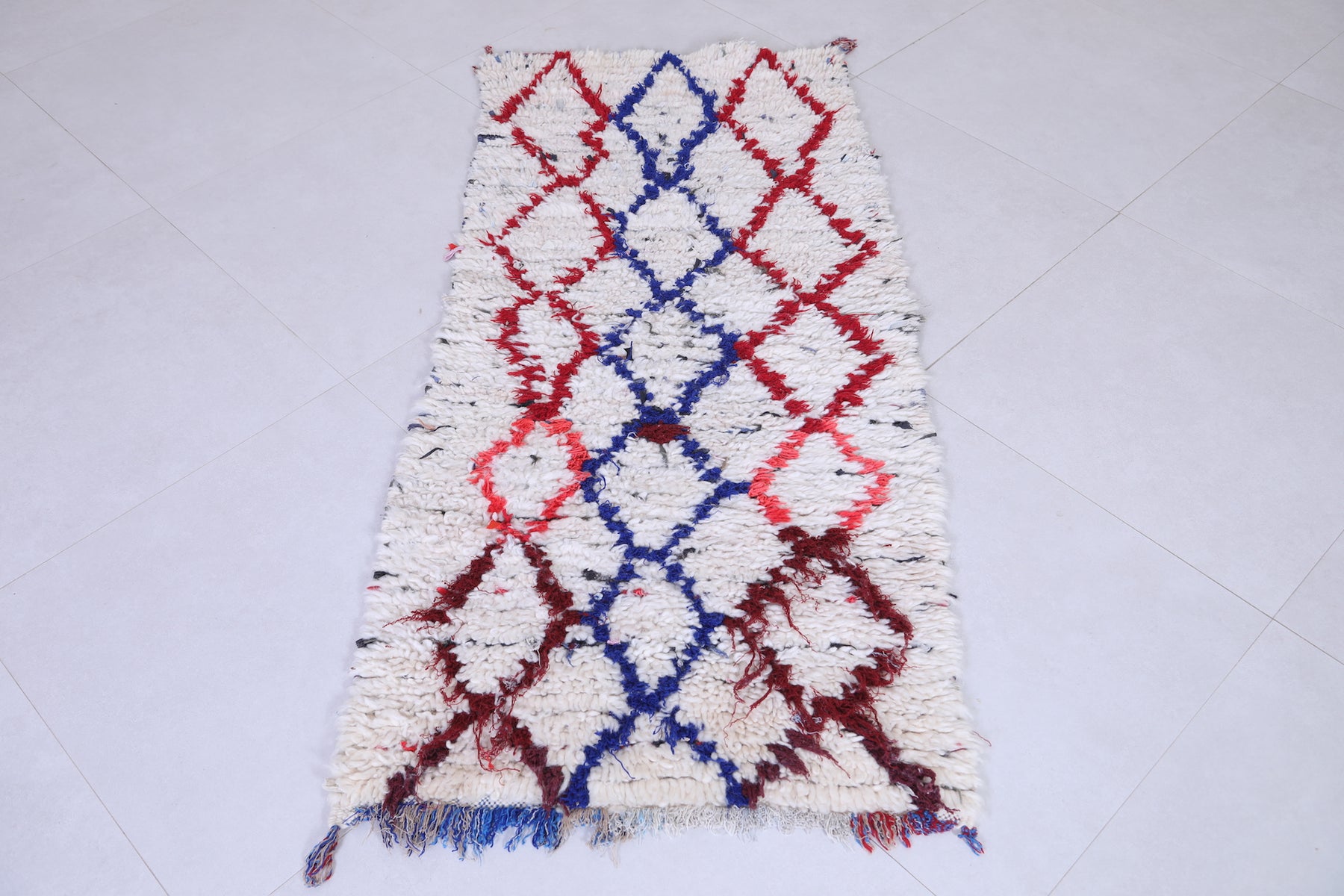 Add bold charm to your home with this Vintage Moroccan Rug featuring a striking red and blue diamond pattern. At 2.4 ft x 5.1 ft, it’s a perfect accent for hallways, bedrooms, or cozy corners.
