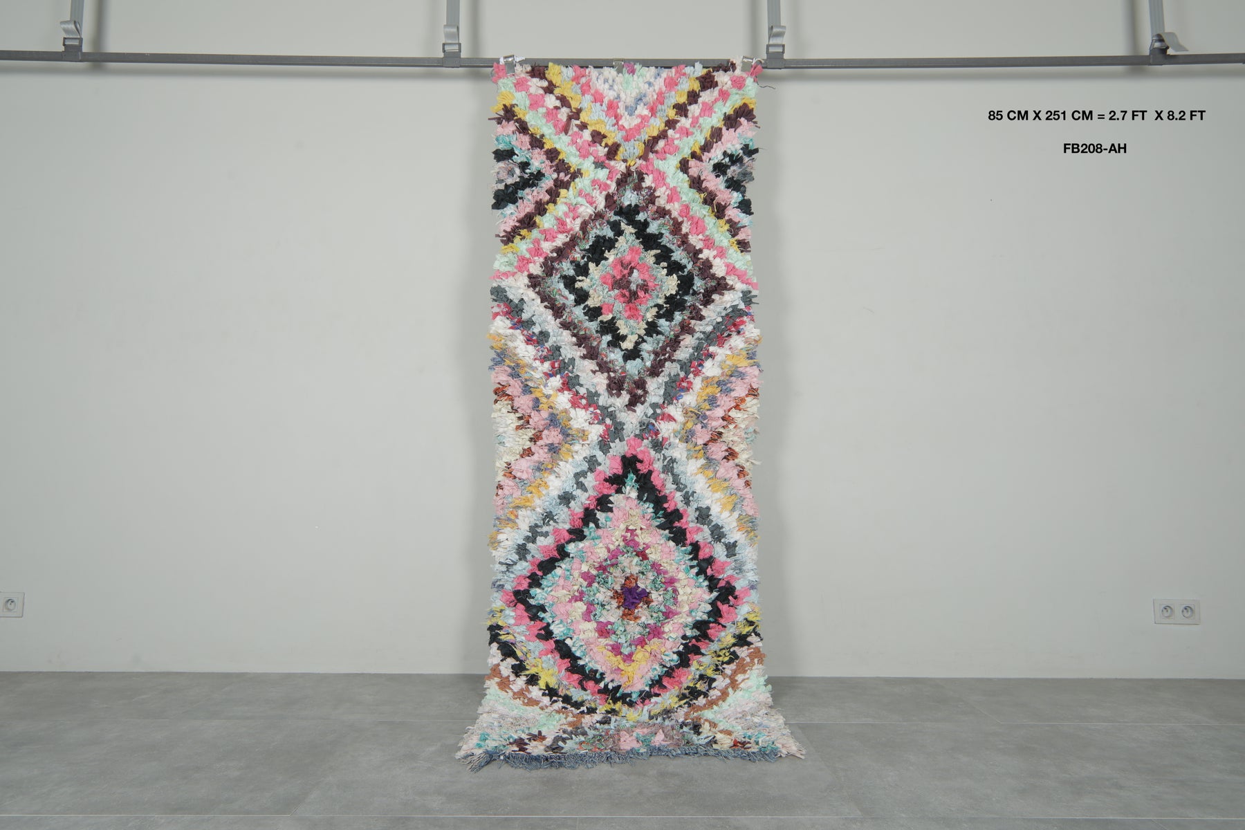 Turn your hallway into a statement space with this luminous Moroccan runner. Featuring bold diamond medallions layered in pink, lavender, aqua, maroon, and yellow, this handwoven treasure bursts with joyful contrast. The overlapping V and lozenge shapes are arranged to create a visual rhythm that draws the eye along the length of the rug, making it perfect for narrow areas in need of color and life.
