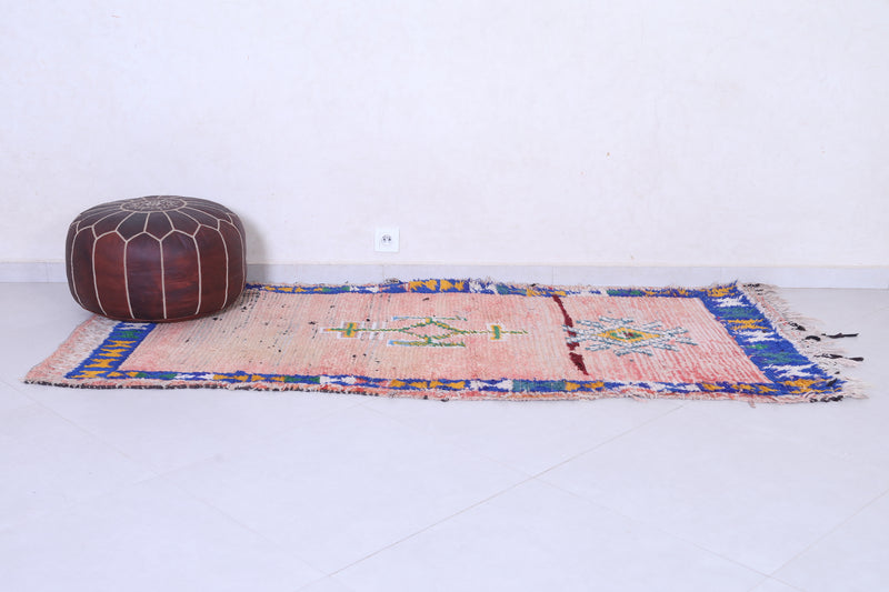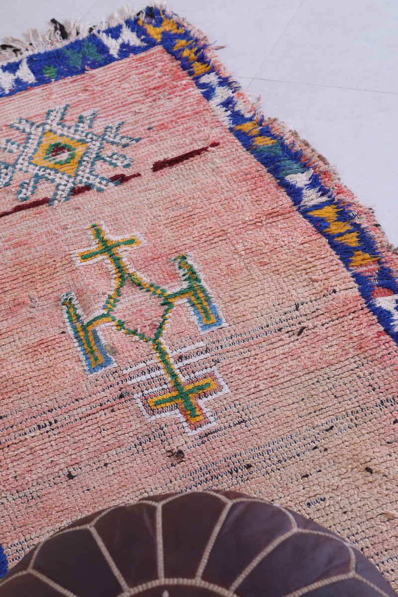 Elevate your interior with this Vintage Moroccan Runner Rug (3.5 x 7.3 FT), featuring tribal symbolism, royal blue borders, and a sun-faded rose base for a truly regal look.