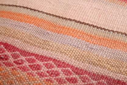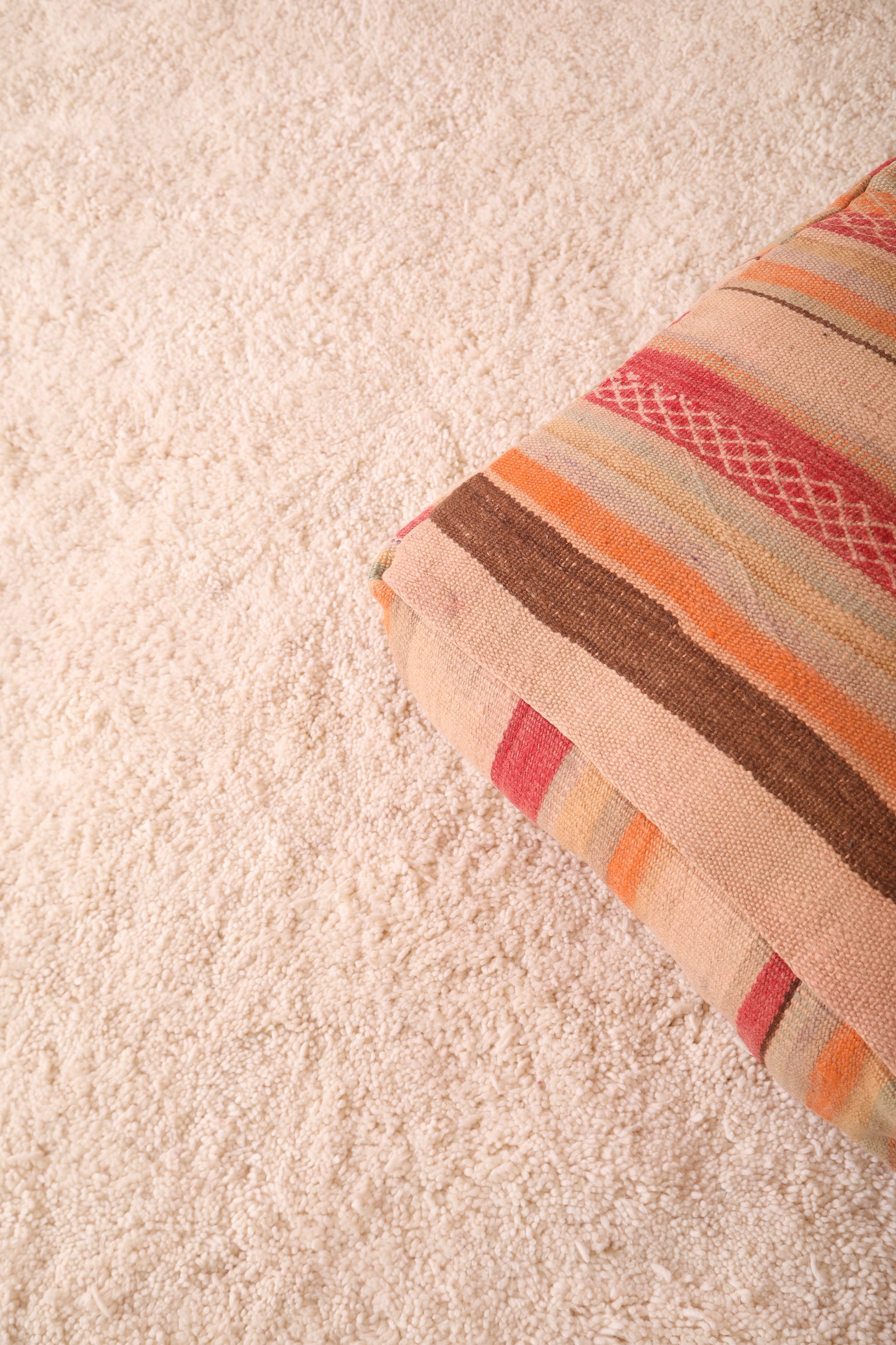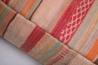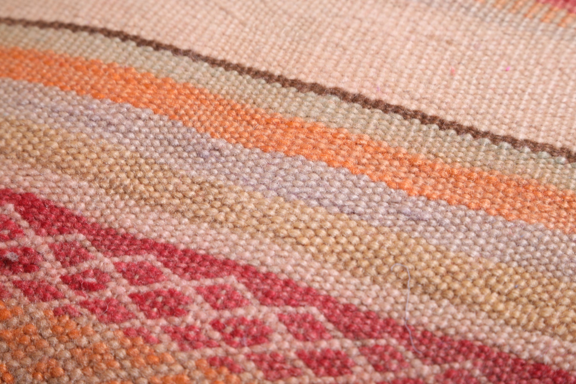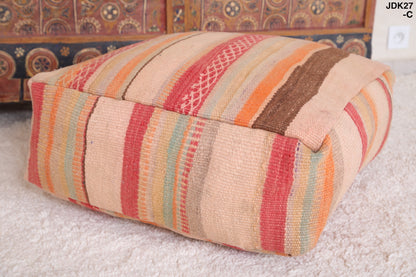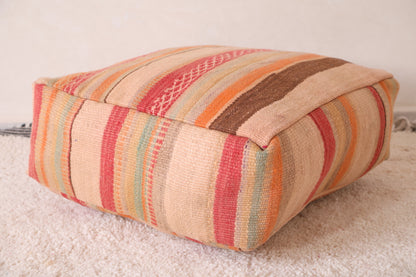 Bring earthy tones and vintage charm into your home with this handmade Moroccan pouf crafted from an old Berber Kilim rug. The soft beige base is enriched by woven stripes in burnt orange, terracotta red, forest green, and pale lavender, giving it a grounded yet colorful presence.