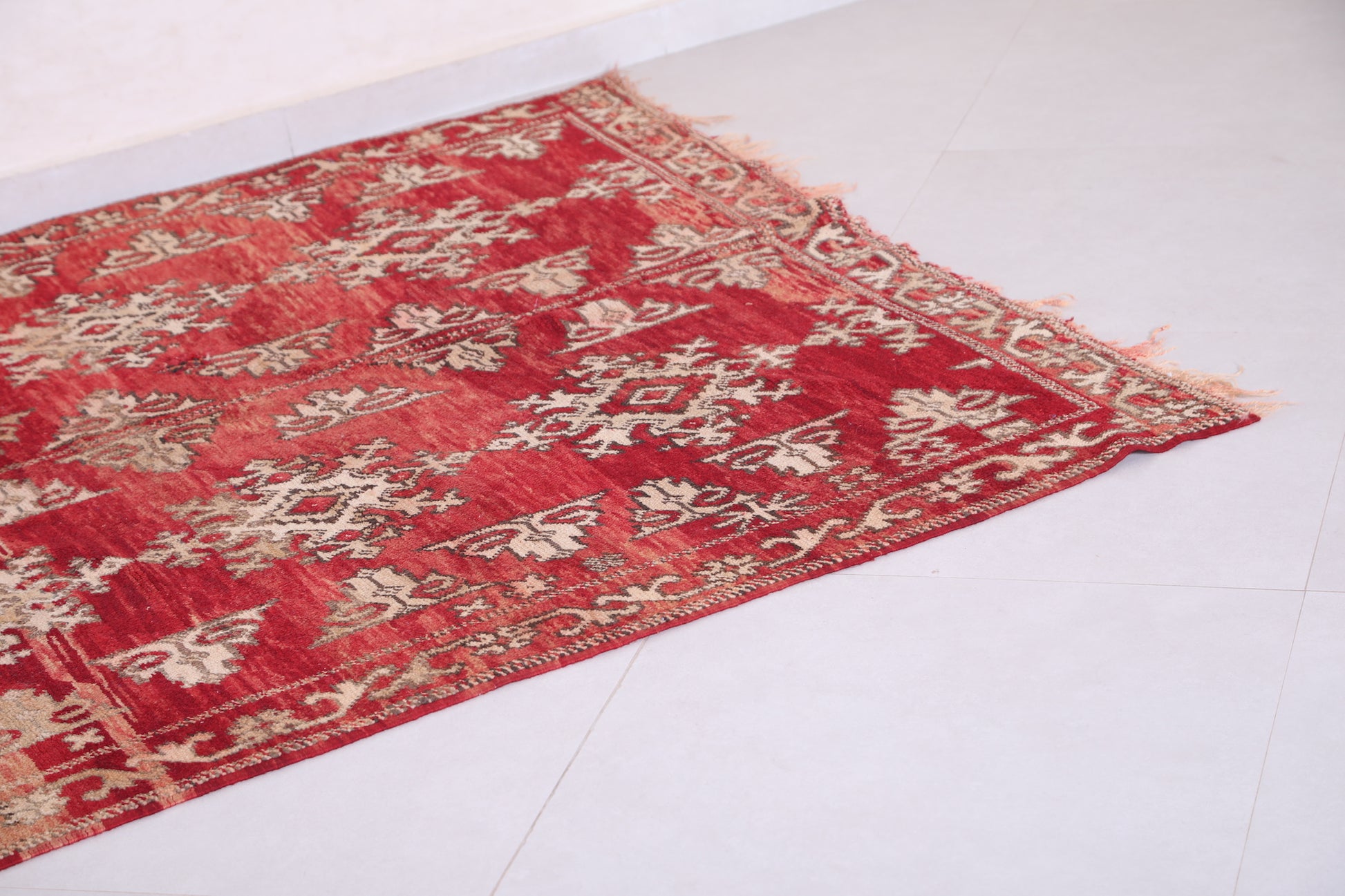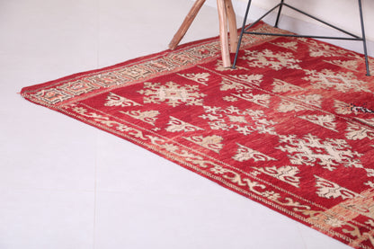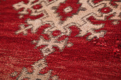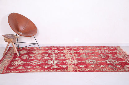 Elevate your living space with this vintage Moroccan rug, measuring 5.2 x 8.6 feet. Showcasing intricate tribal patterns in warm burgundy and beige tones, this handwoven masterpiece blends authentic Moroccan craftsmanship with a timeless aesthetic. Its rich color palette and elegant motifs make it a versatile choice for living rooms, dining areas, or bedrooms, offering both style and durability.