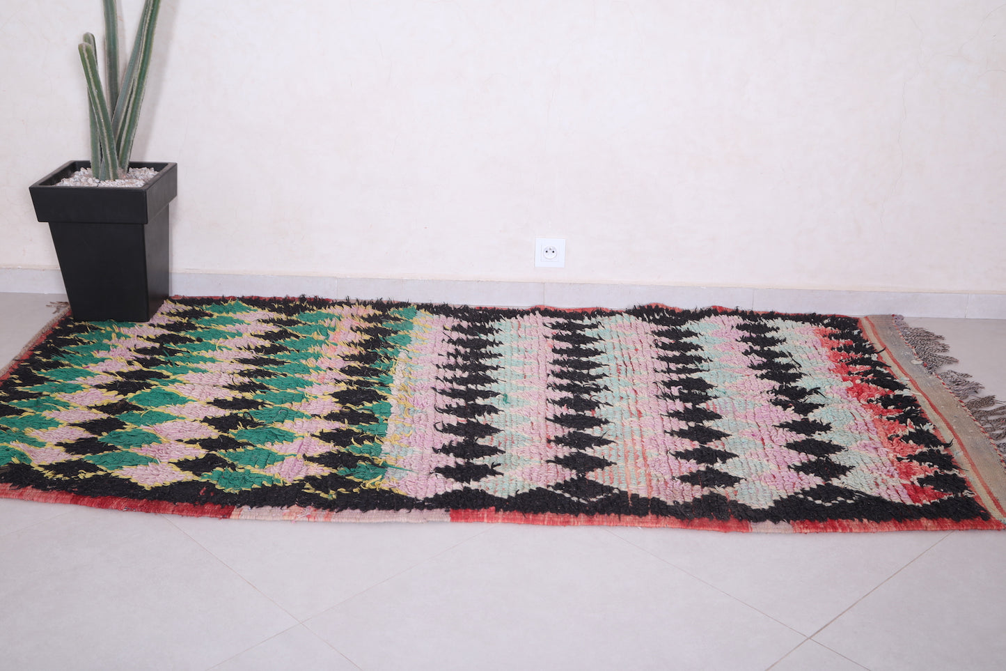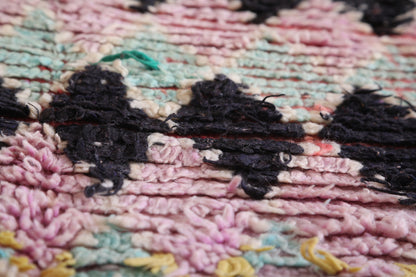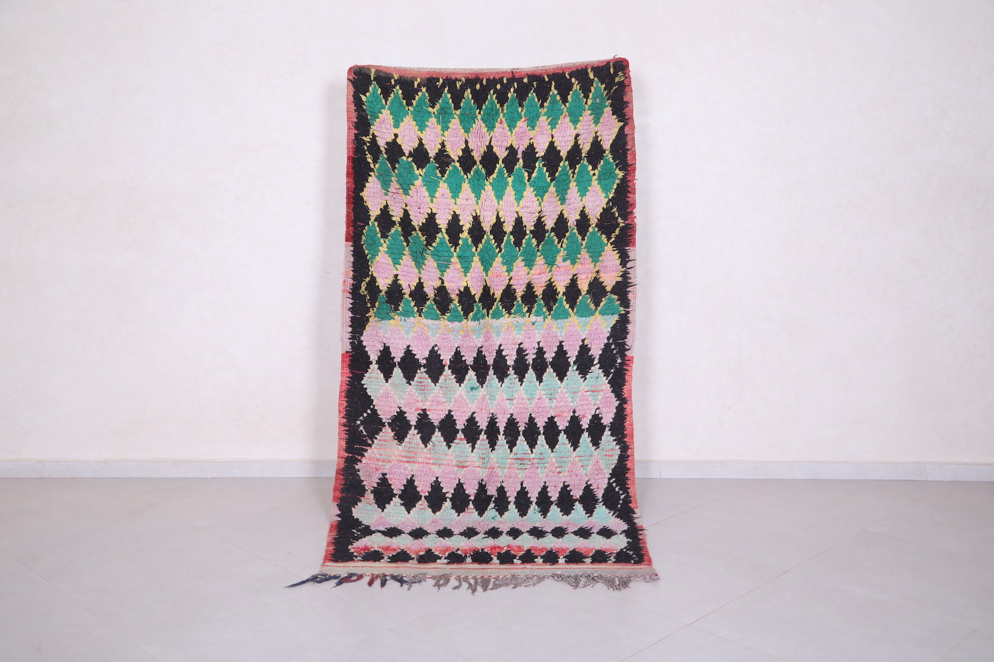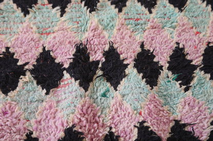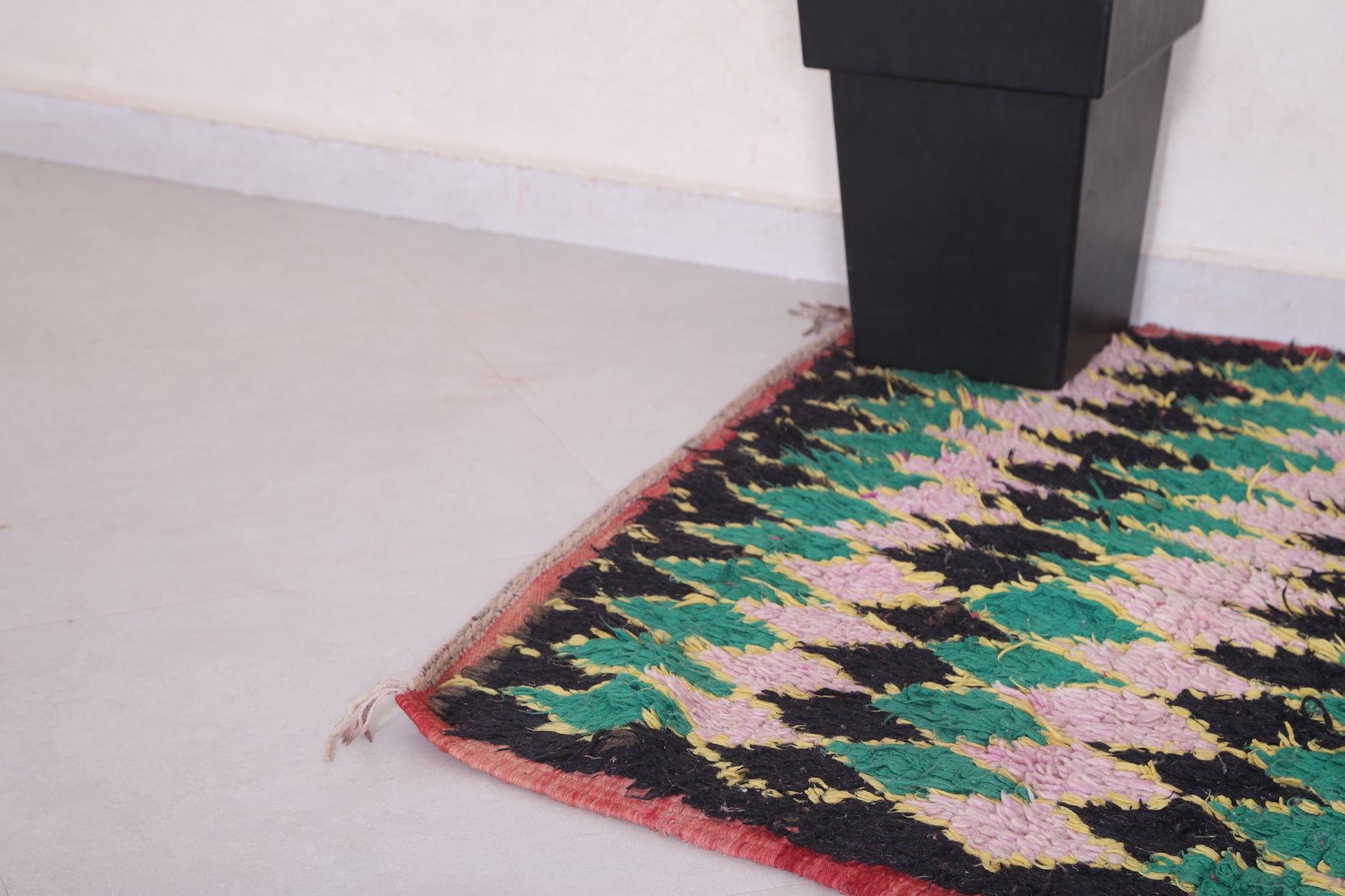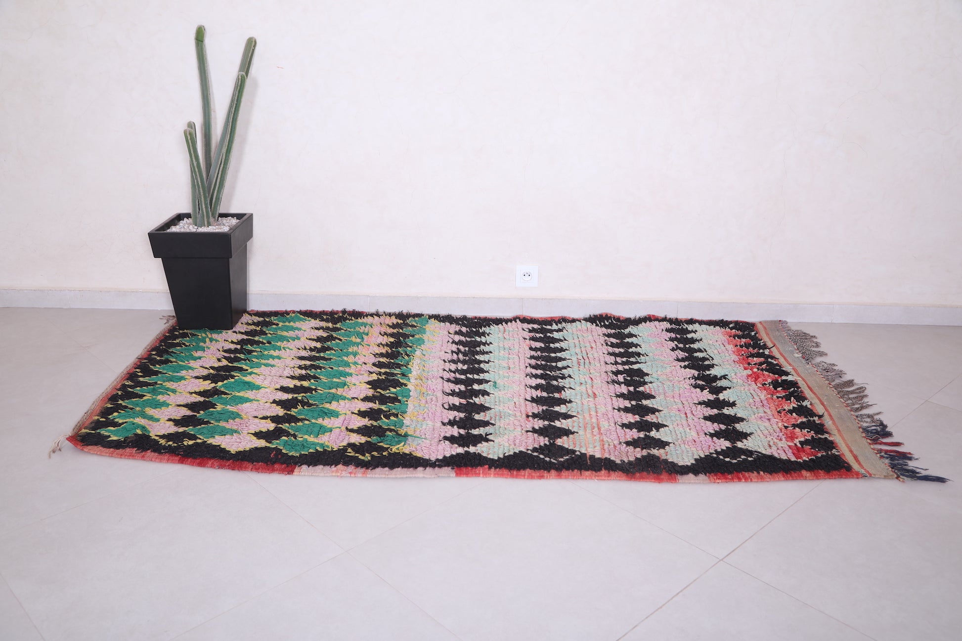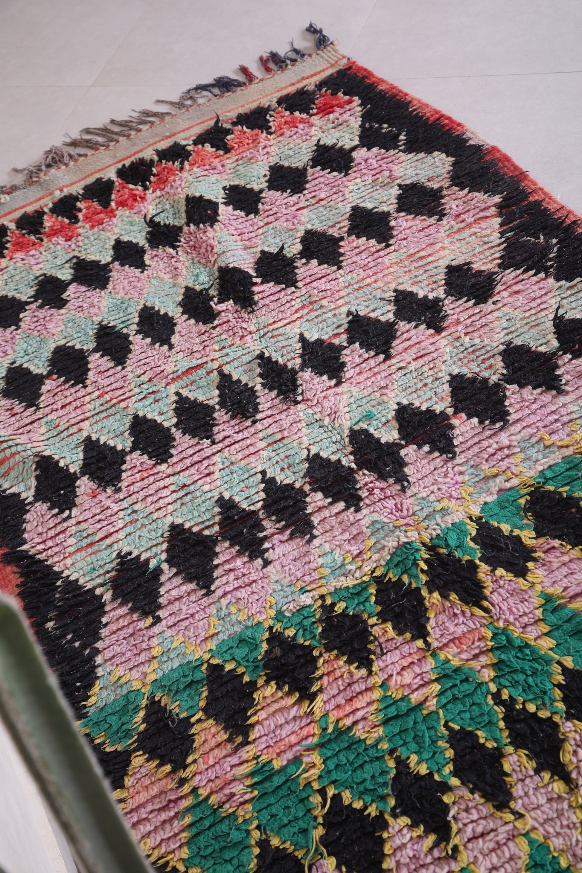 Infuse your space with vibrant charm using this Vintage Runner Rug, sized at 3.8 x 7.6 feet. Featuring a bold harlequin pattern in shades of green, pink, black, and yellow, this handwoven Moroccan piece is perfect for hallways, entryways, or narrow spaces in need of a colorful and artistic touch. Its intricate design and durable craftsmanship ensure it remains a standout piece for years to come.