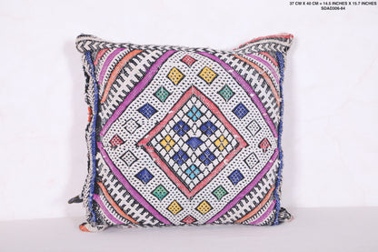 Add authentic Moroccan charm to your space with this handcrafted Vintage Kilim Moroccan Pillow, sized at 14.5 x 15.7 inches (37 CM x 40 CM). Showcasing intricate multicolored geometric patterns, this pillow blends traditional Berber craftsmanship with timeless cultural appeal. Perfect for accenting your sofa, bed, or reading nook with a touch of global artistry.