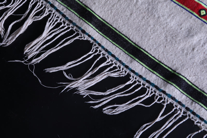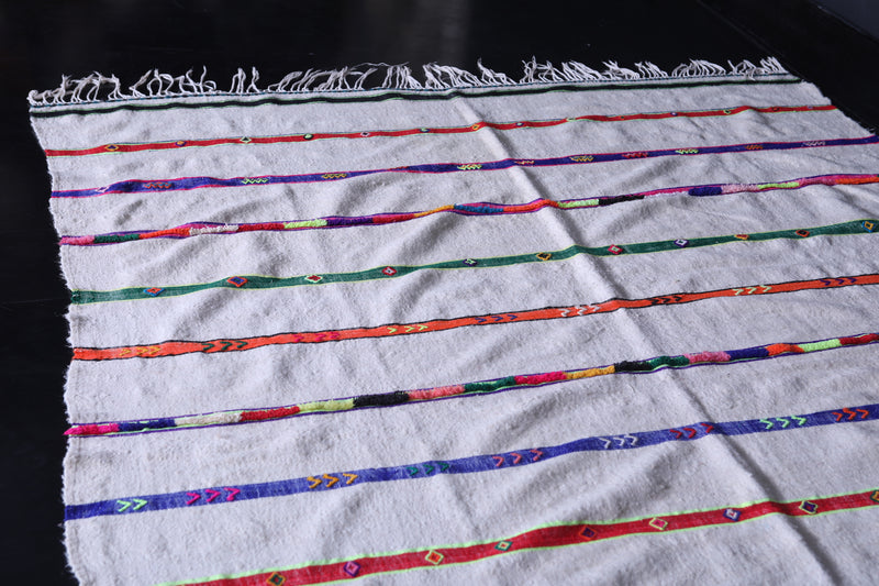 Add vibrant charm and cultural artistry with this Handwoven Wedding Berber Rug. Measuring 5.5 FT x 7.2 FT, this Moroccan-made piece features colorful horizontal stripes and traditional tribal motifs on a soft, neutral base. Whether styled as a rug, wall hanging, or decorative throw, it adds joyful energy and heritage to any room.