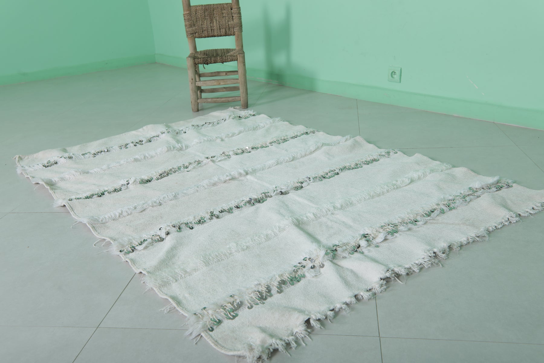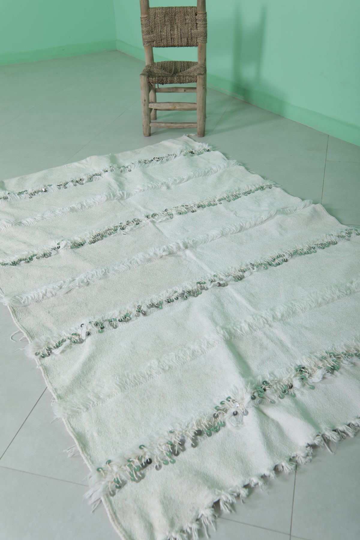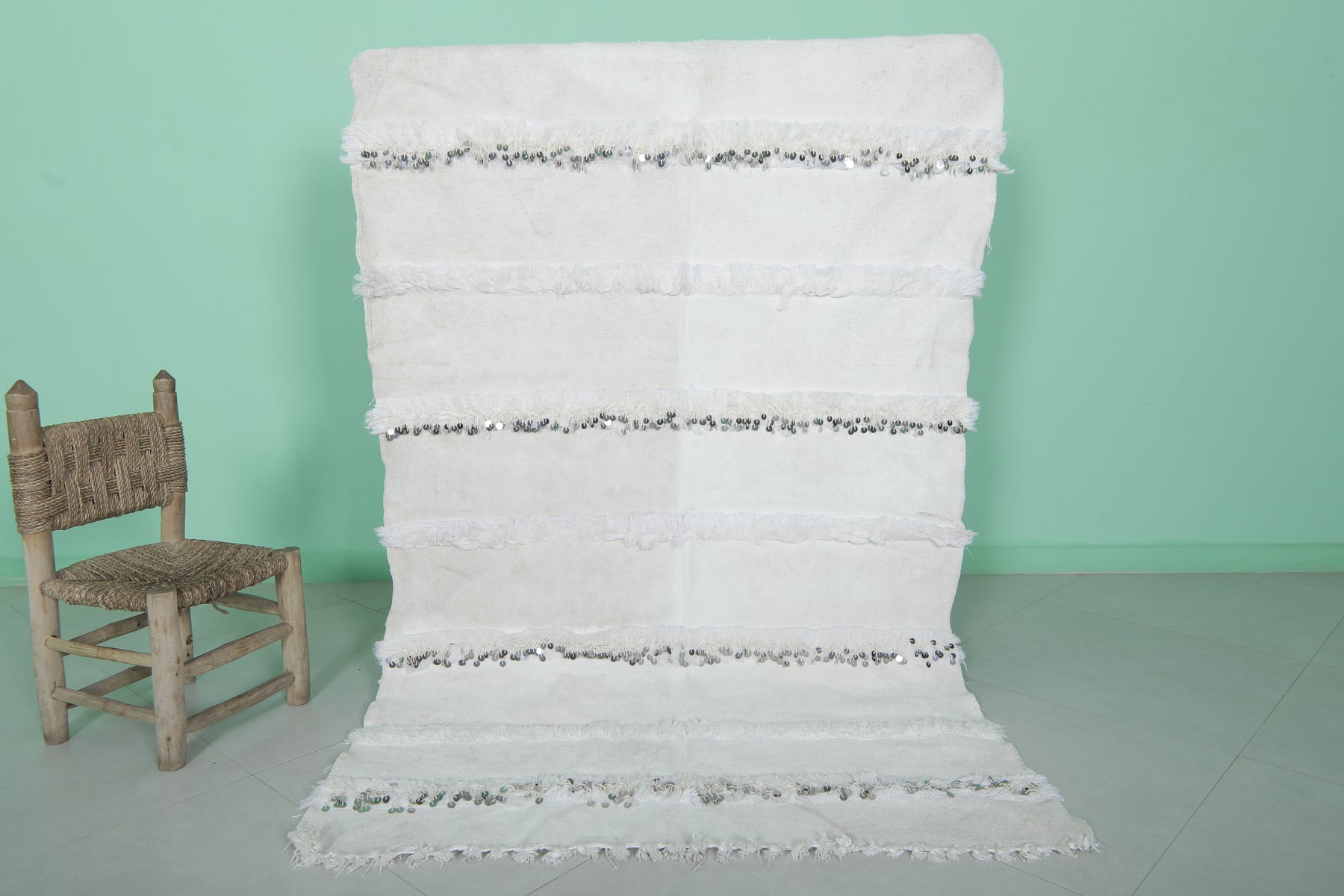 Add elegance and tradition to your space with this White Berber Wedding Blanket. Measuring 3.8 FT x 5.9 FT, this handwoven Moroccan textile is a timeless accent, perfect as a decorative throw, cozy rug, or statement wall piece.