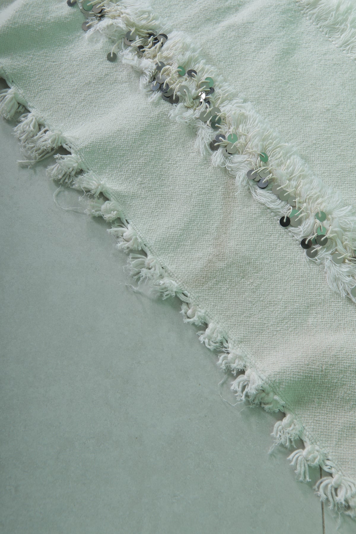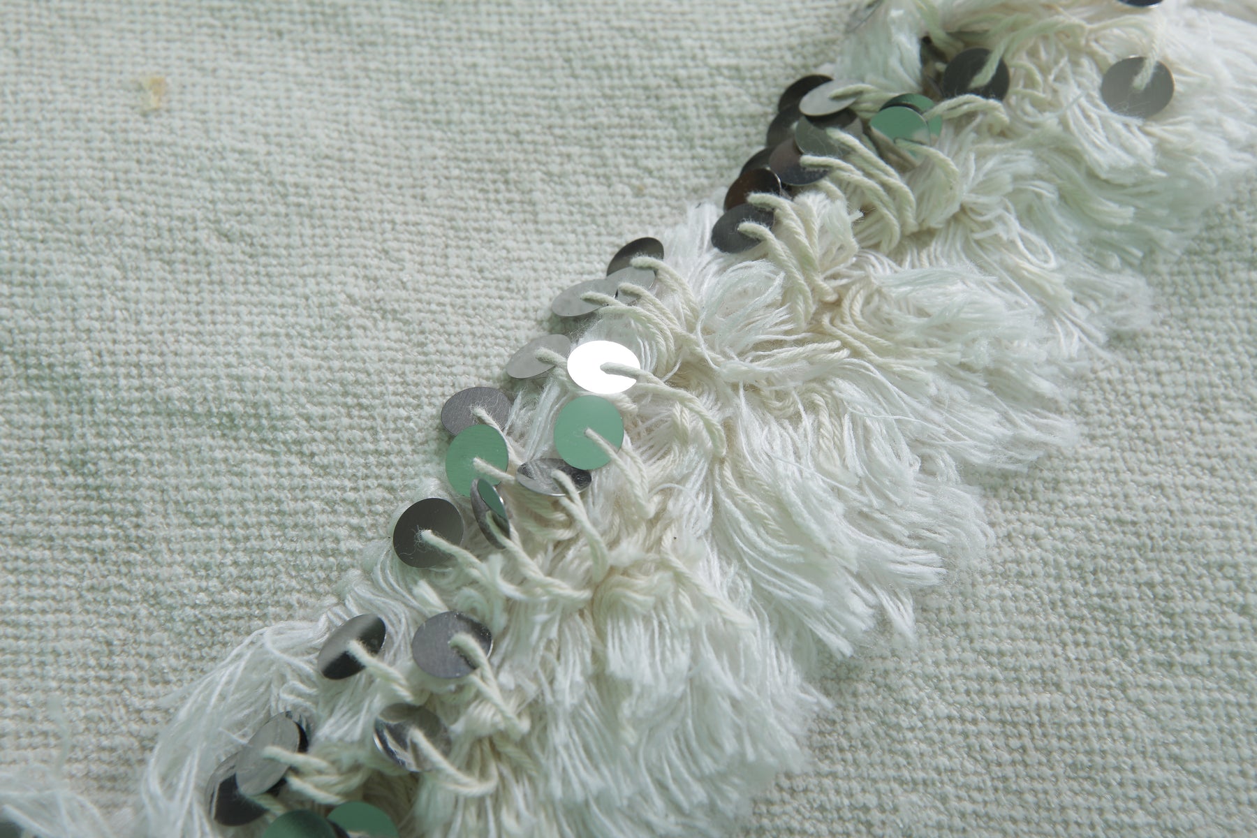 - Features tonal white striping and metallic sequin accents.