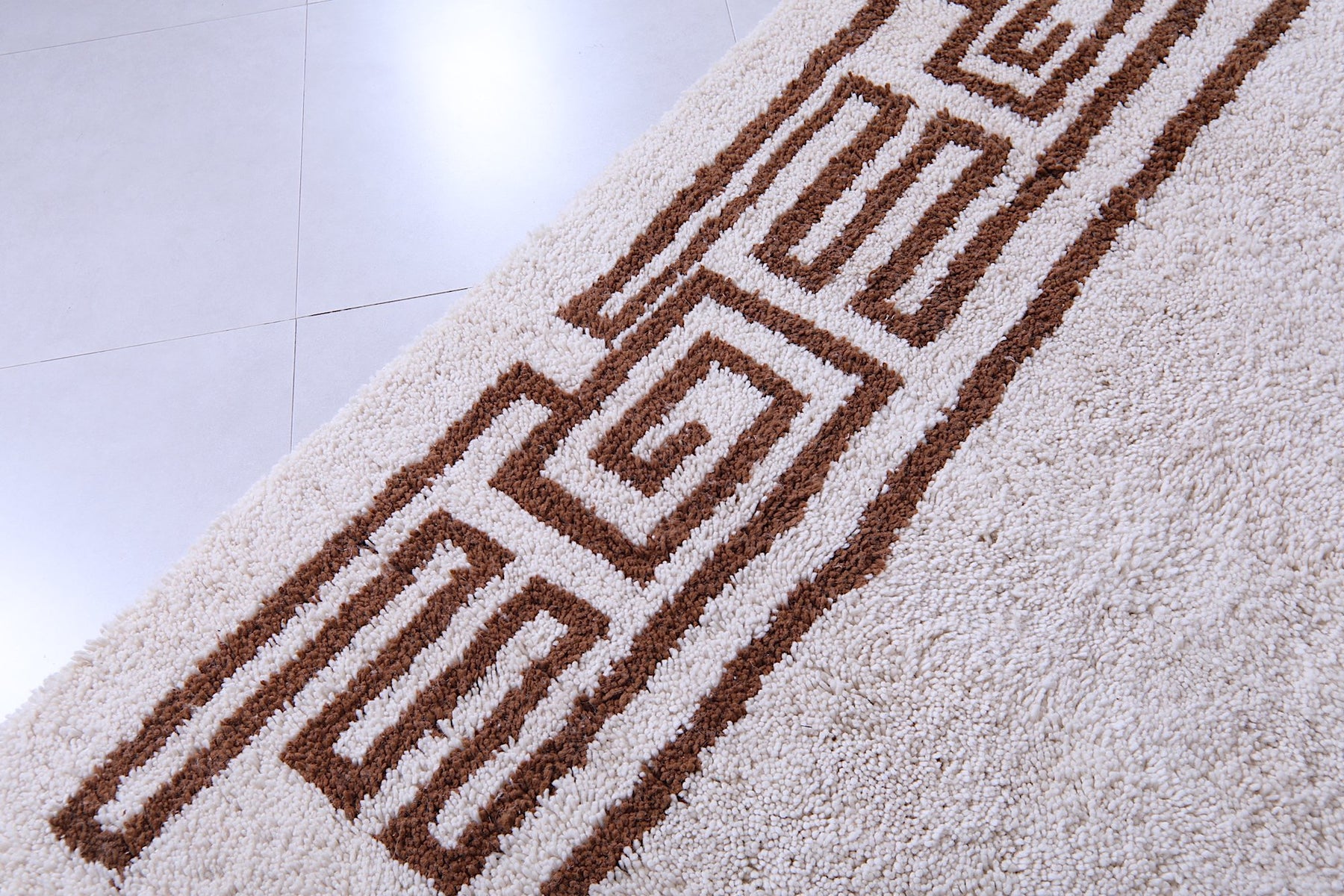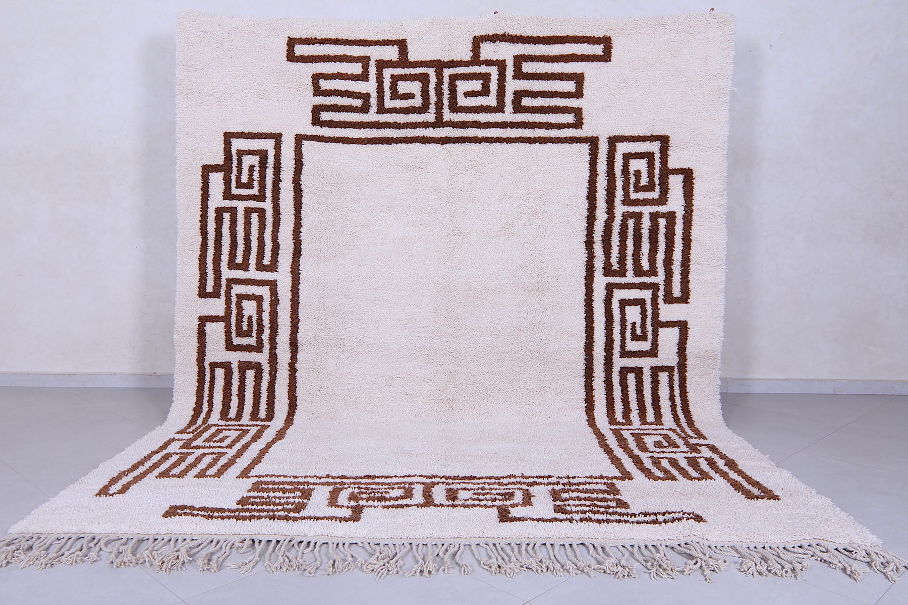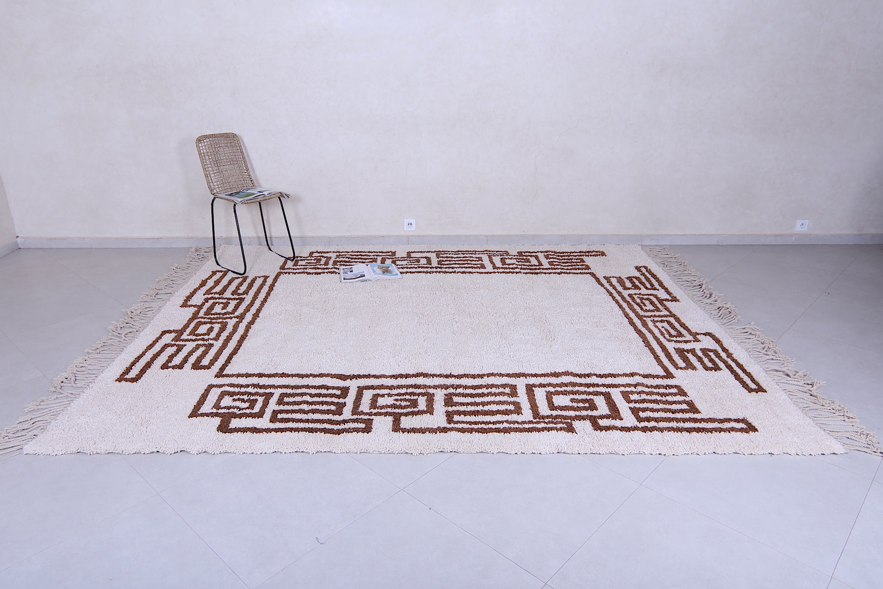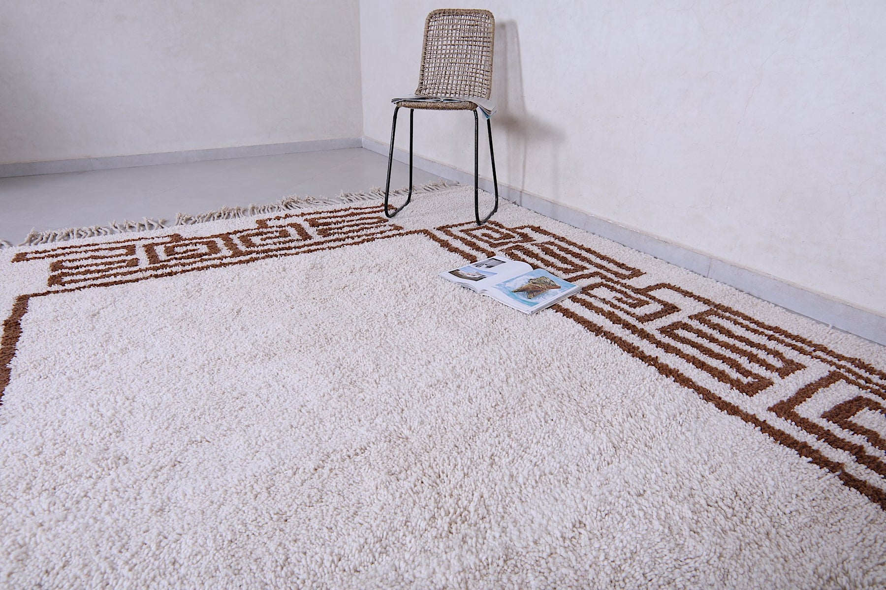 This handmade Moroccan Berber rug is crafted from 100% natural wool, bringing soft texture and exceptional quality to your space. Featuring a unique geometric border pattern, this design draws inspiration from ancient Amazigh symbolism, where every shape tells a story. The warm earthy brown pattern contrasts beautifully against the creamy white background, creating a bold frame-like effect that naturally draws the eye.