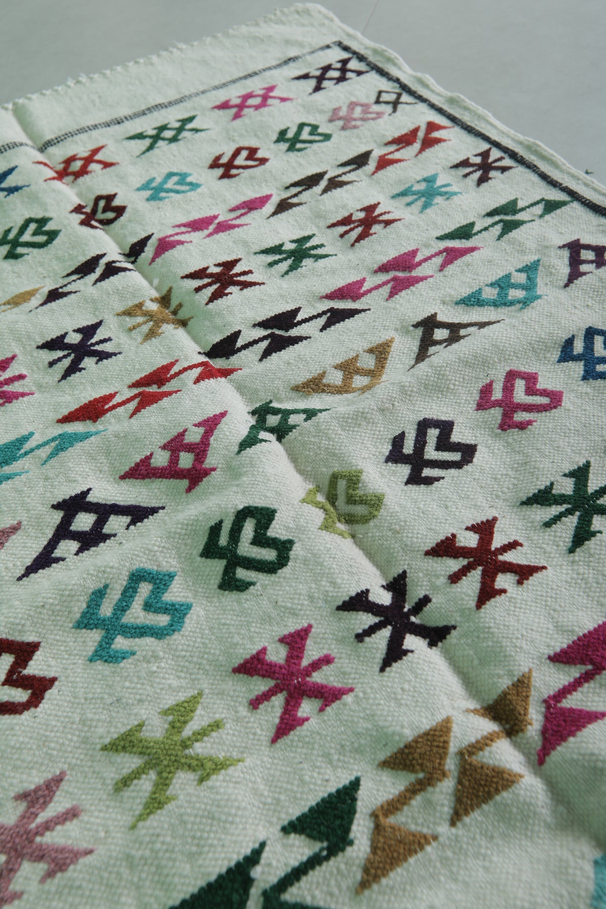 This 3.1 x 4.9 feet White Moroccan Rug features a clean ivory base adorned with vibrant handwoven geometric motifs, creating a playful yet elegant statement. Its compact size and colorful detailing make it perfect for nurseries, bedrooms, or cozy alcoves.