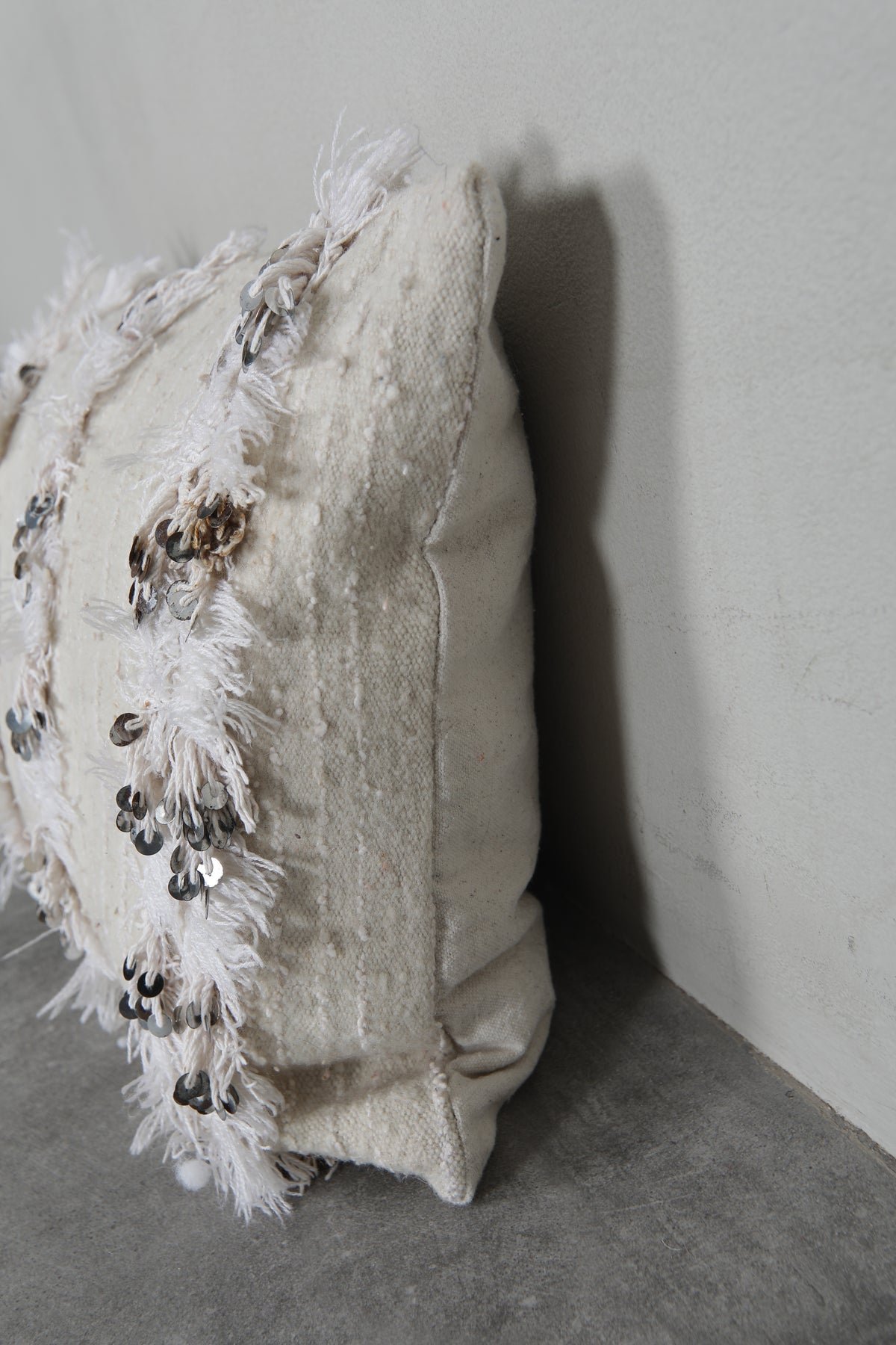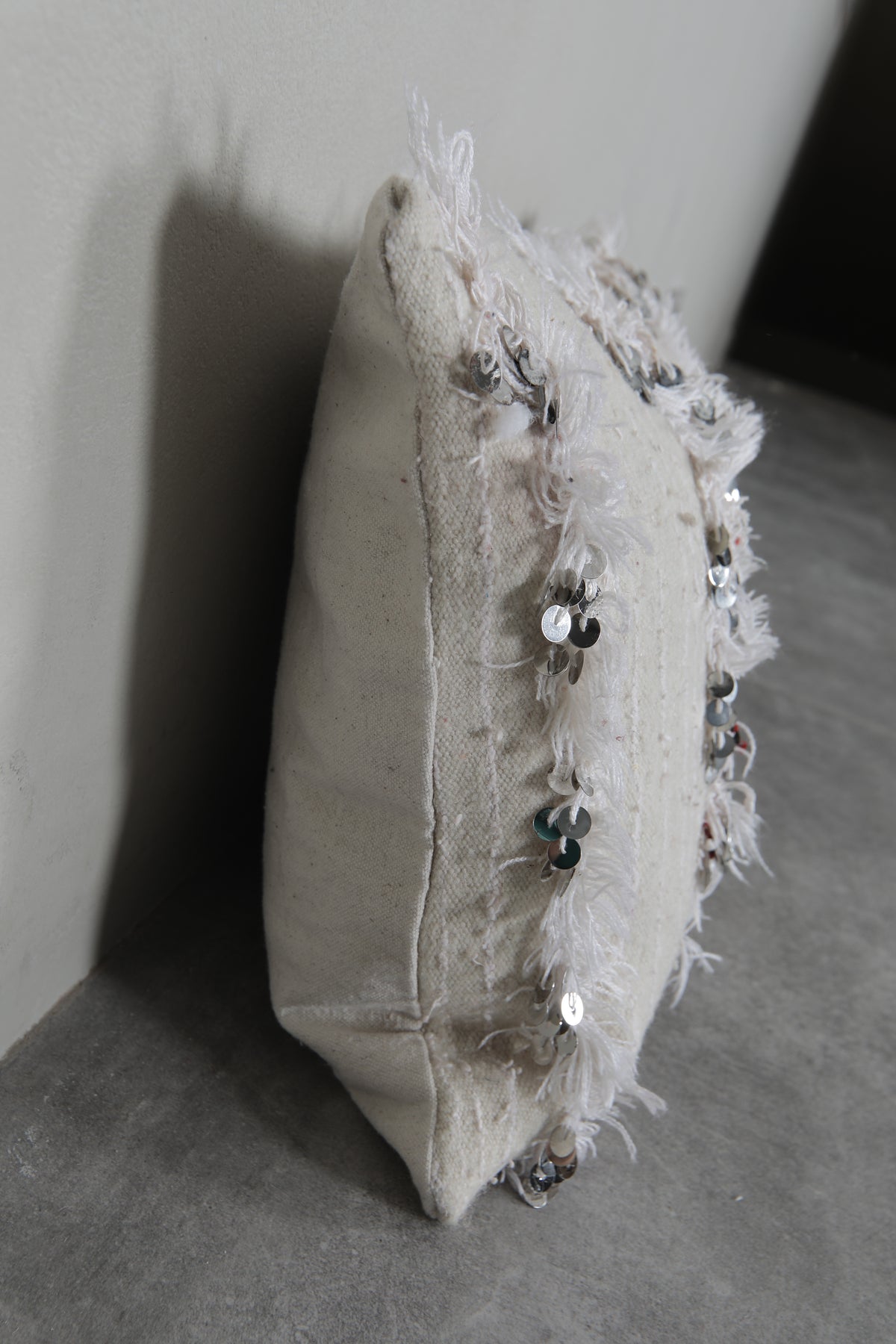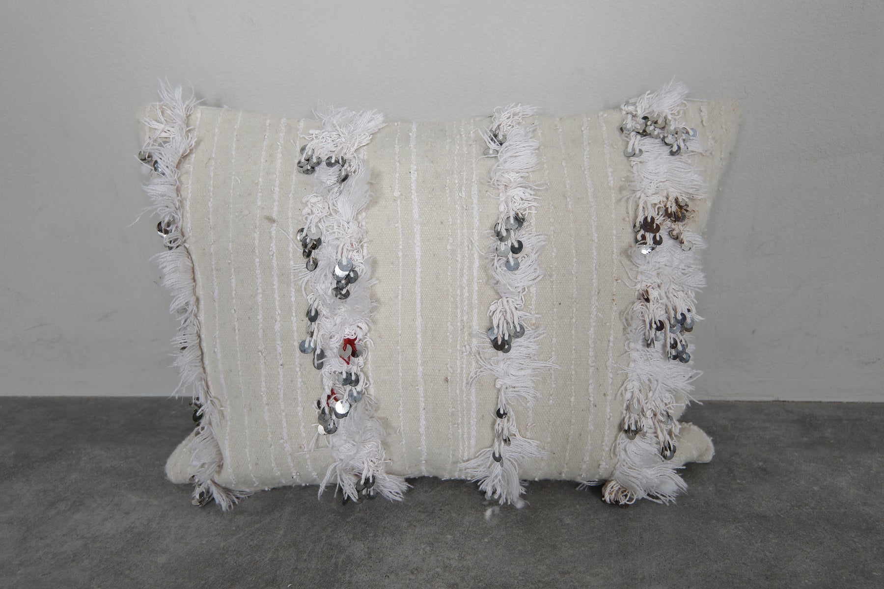 Enhance your space with this white Moroccan wedding pillow, beautifully adorned with hand-sewn sequins and textured fringe detailing. The intricate design showcases traditional craftsmanship, making it a perfect accent for your living room or bedroom. Handwoven with care, this pillow blends elegance and bohemian charm. Size: 16.5 x 20.8 inches.