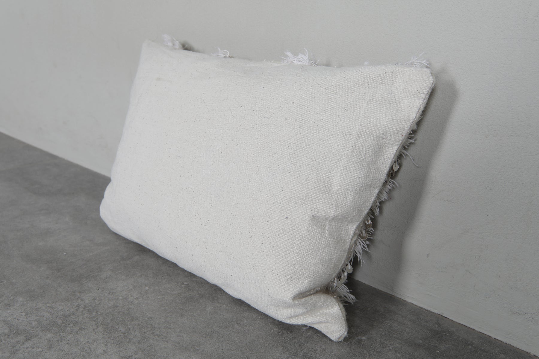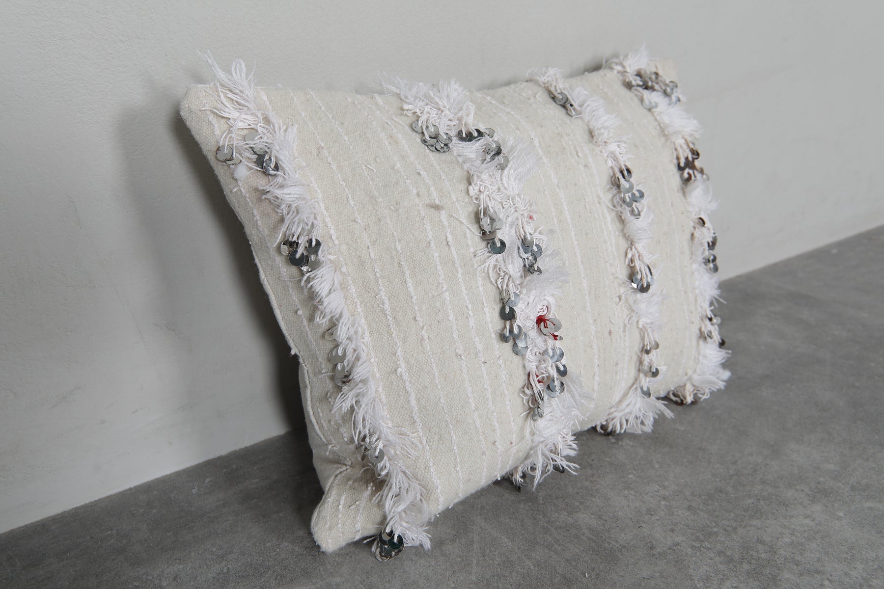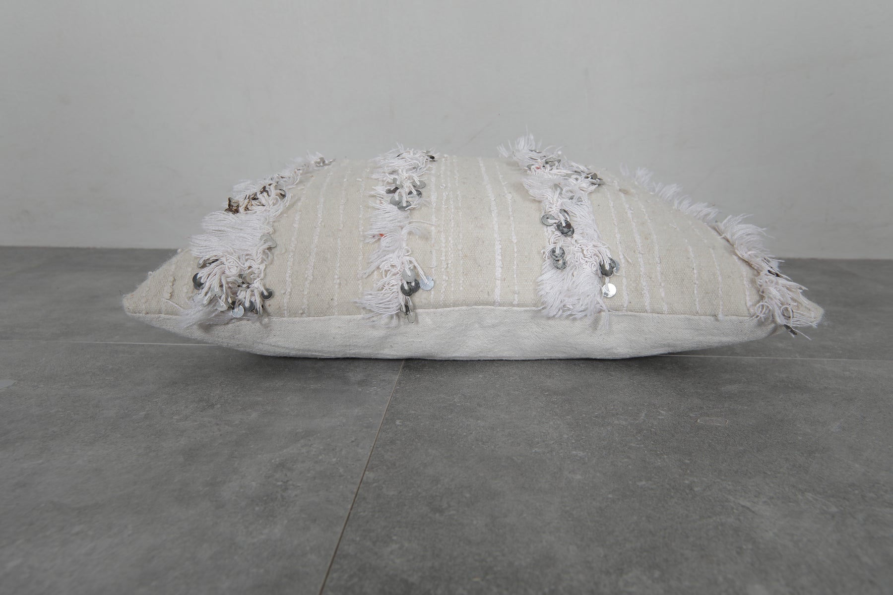Enhance your space with this white Moroccan wedding pillow, beautifully adorned with hand-sewn sequins and textured fringe detailing. The intricate design showcases traditional craftsmanship, making it a perfect accent for your living room or bedroom. Handwoven with care, this pillow blends elegance and bohemian charm. Size: 16.5 x 20.8 inches.