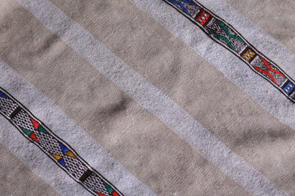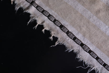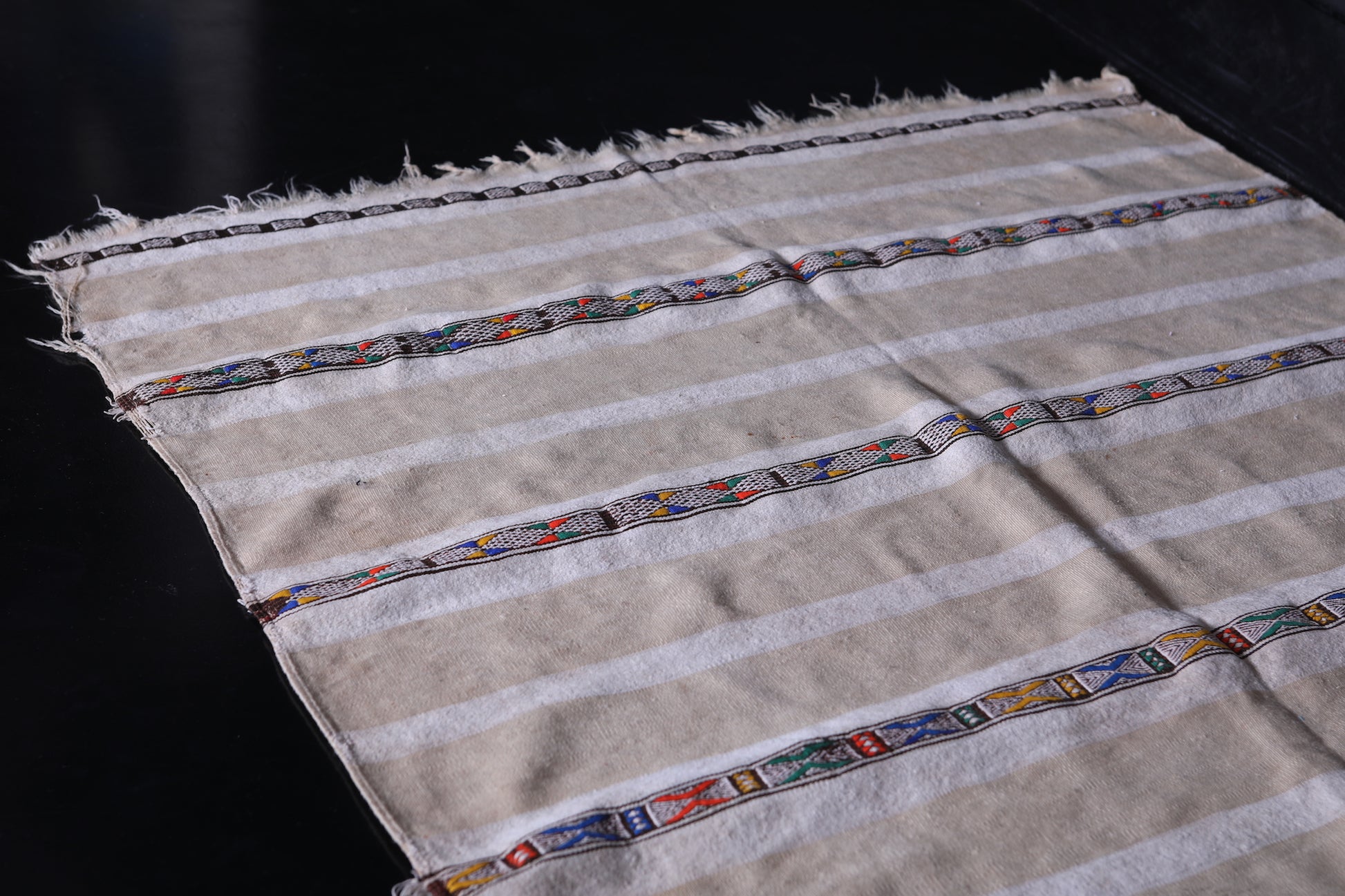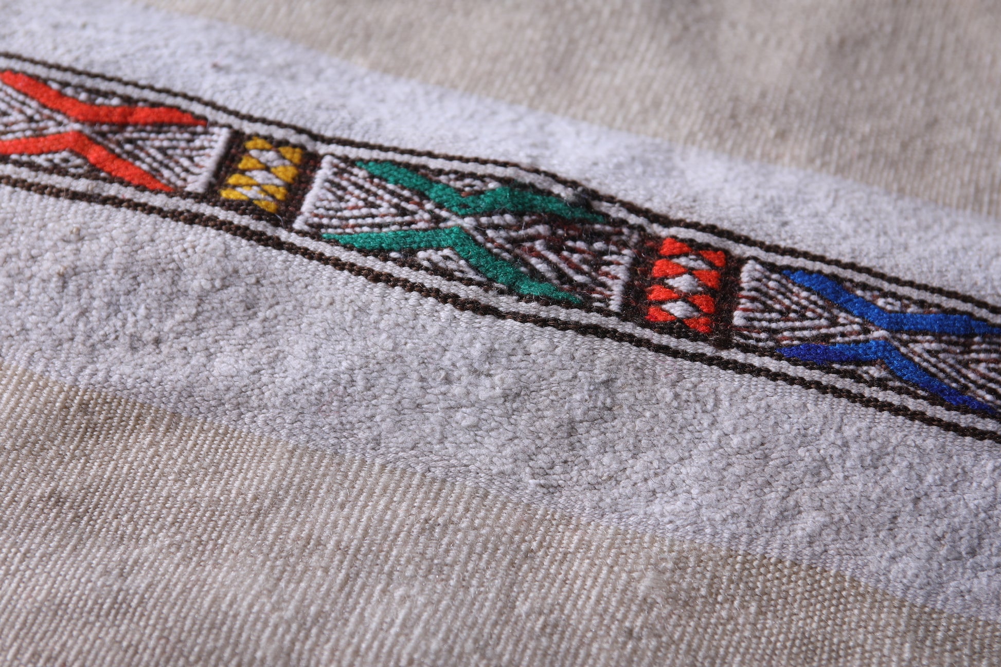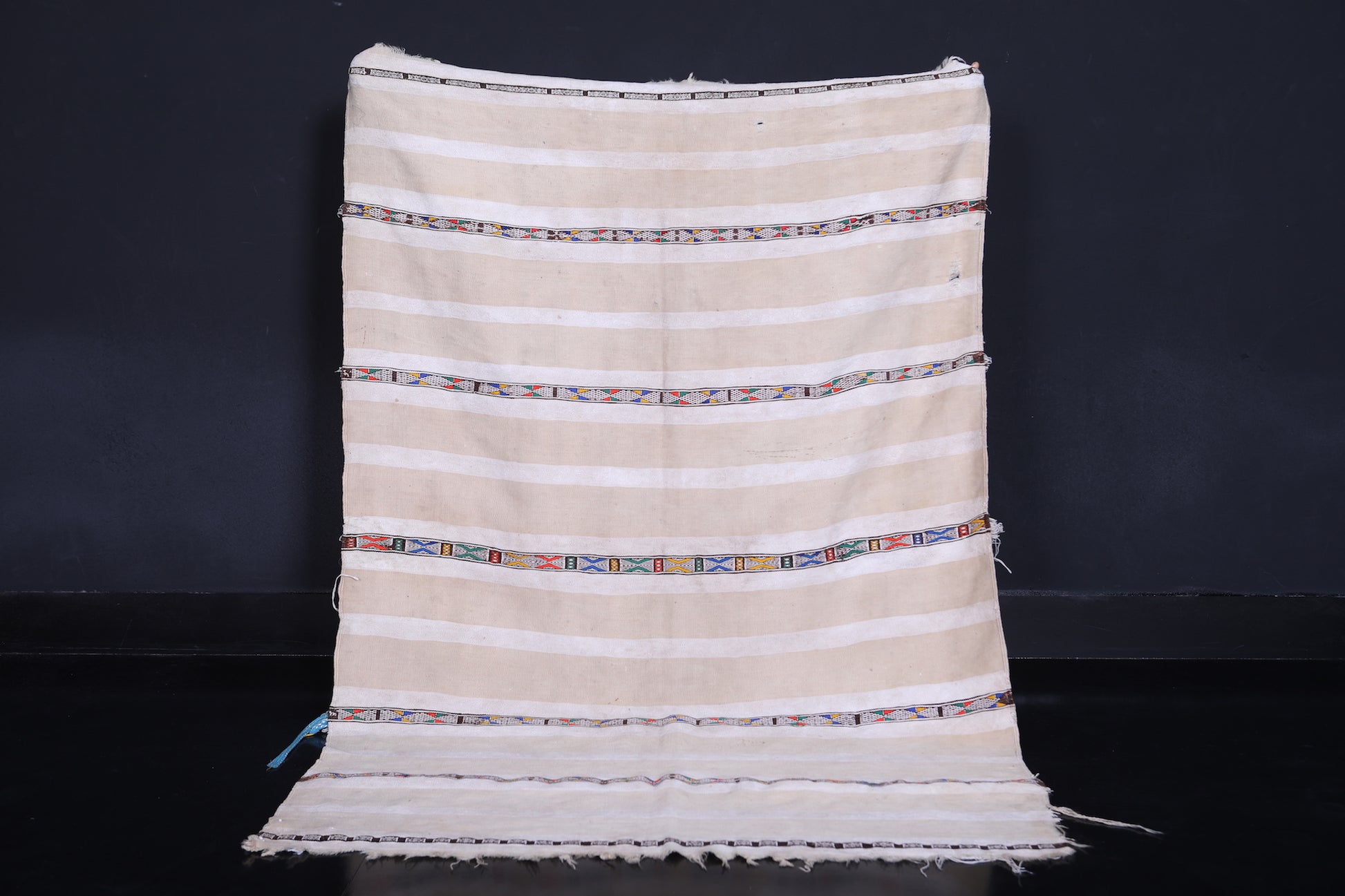 This 3.8 x 5.6 feet traditional Moroccan Kilim rug features a soft ivory base adorned with colorful embroidered geometric bands, blending elegance with cultural richness. Handwoven with precision, this rug adds warmth and character, making it a perfect accent for living rooms, bedrooms, or as a statement piece in any space.