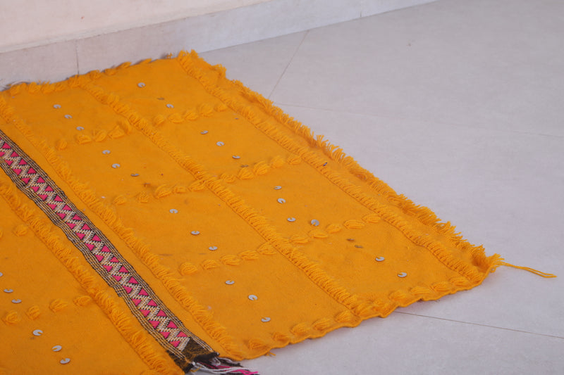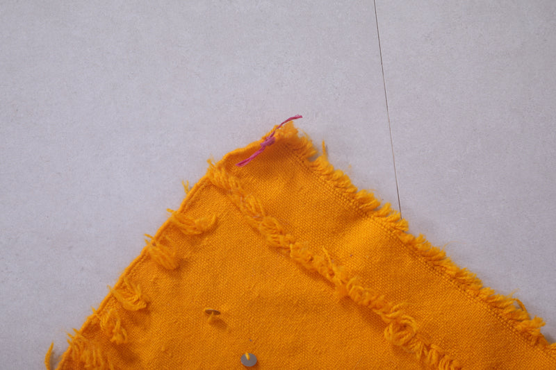 This 2.8 x 4.4 feet Yellow Moroccan Handwoven Kilim features a warm golden hue accented with intricate Berber patterns and delicate embroidered details. A true testament to authentic Moroccan craftsmanship, this kilim brings vibrancy and cultural charm to any space, making it ideal for boho-inspired or eclectic interiors.